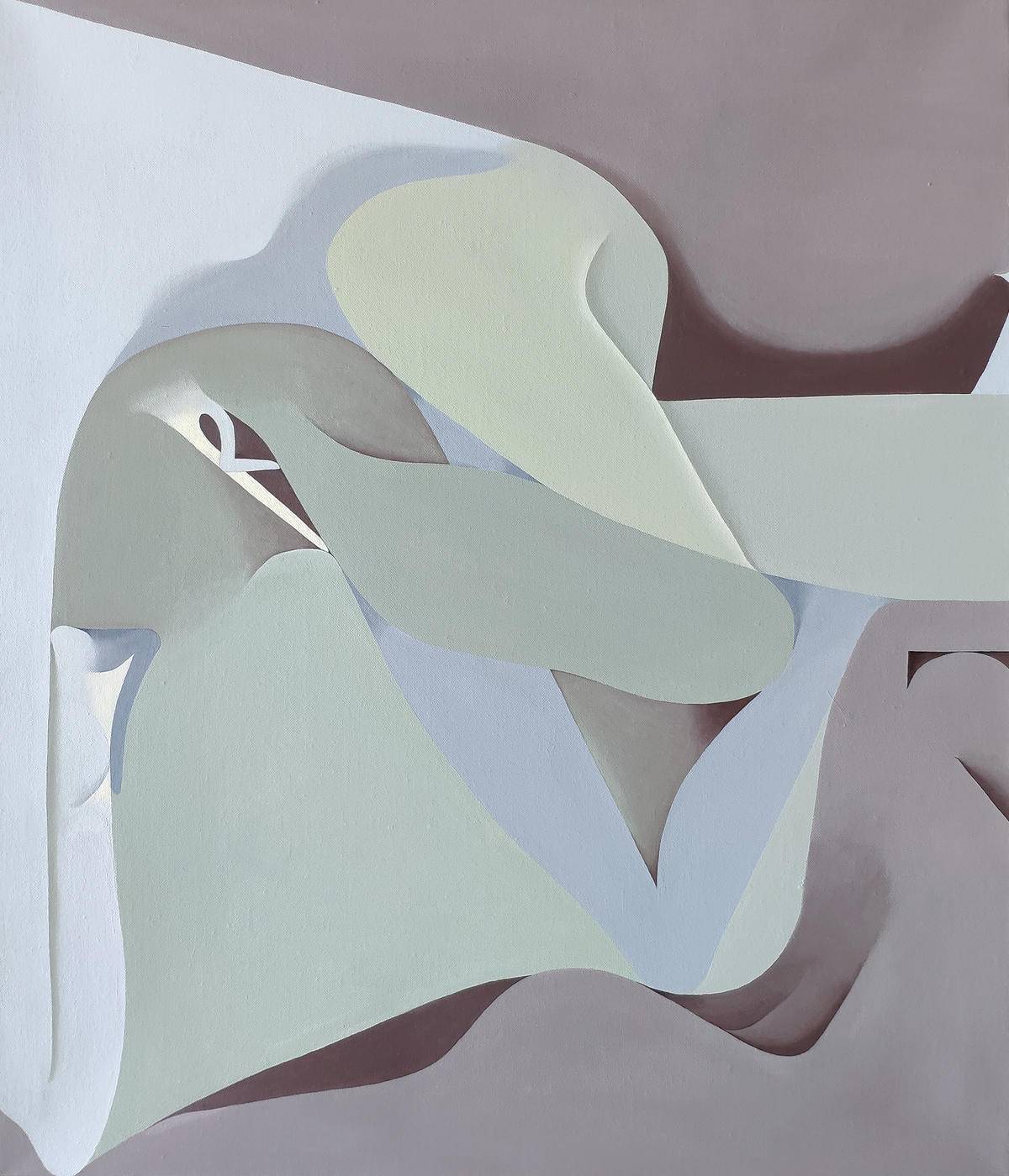 2021年,多年来的个人生活经历让我逐渐感知到当下的我所偏属的灵魂色调,明亮的纯色对我来说已变得单薄又刺眼,我不由自主地转向那深不见底又微有倾向的灰色调,画面趋向低调和隐忍,用色变得极为吝啬和小心,结构没有脱离我的个人“魔法”,这依然是我最上瘾的武器,它捆绑了“我要表达什么”,让我的精神世界逐渐放松地在此安营扎寨。