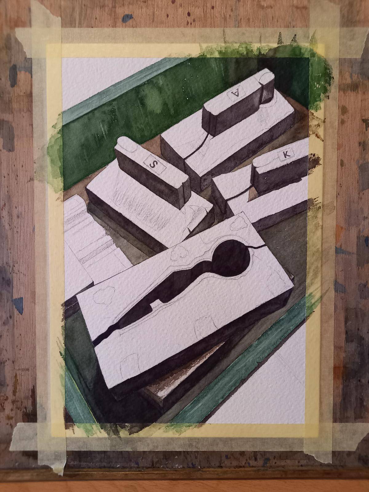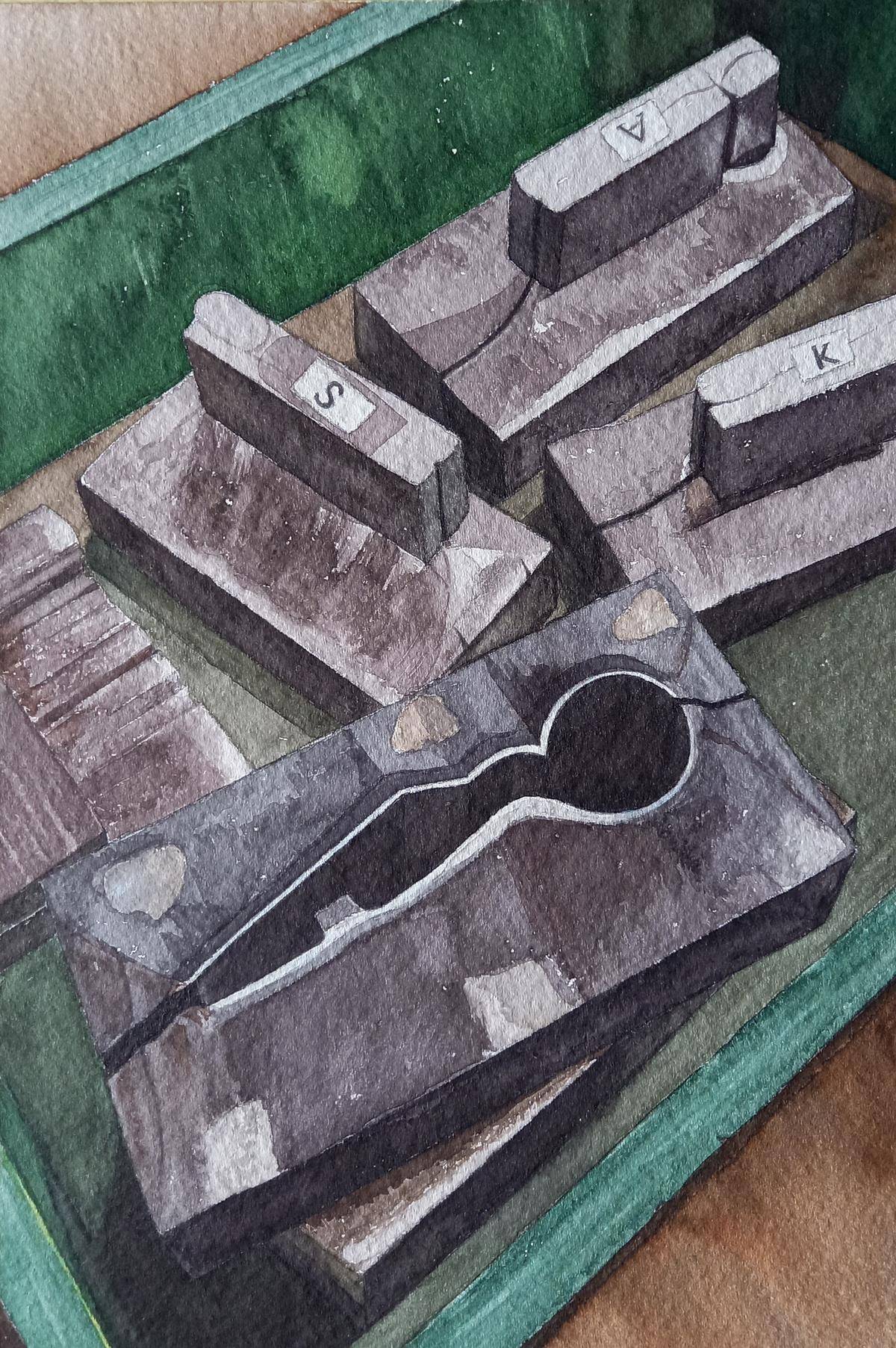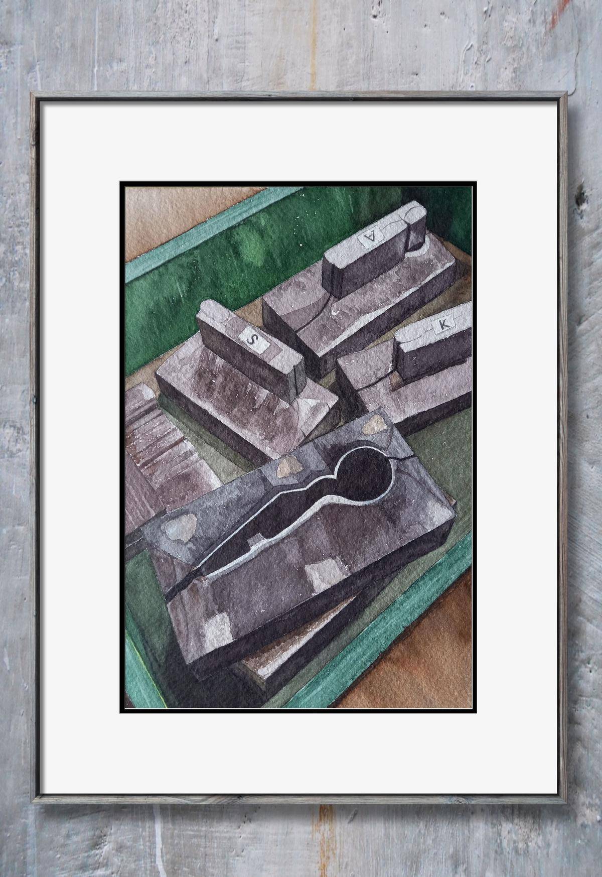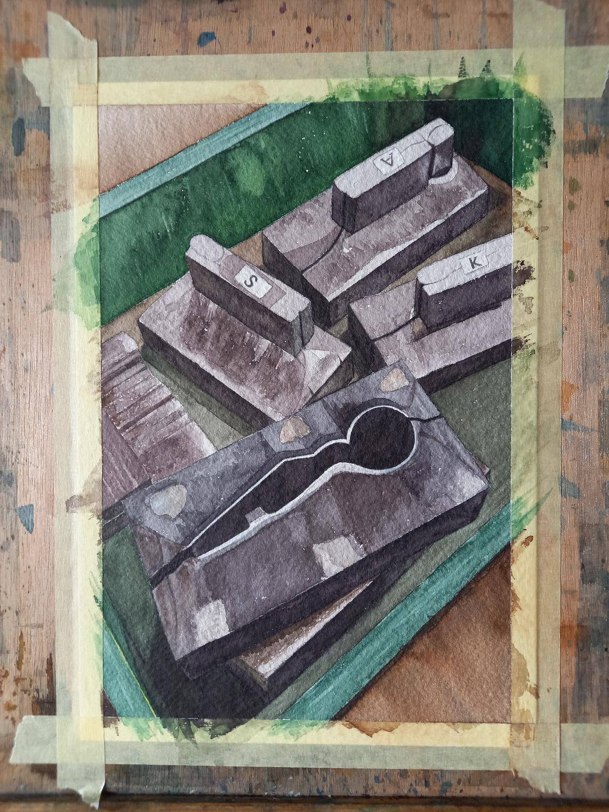 画作致敬德国制造的工匠精神。Solingen ,世界知名的刀具城,大家耳熟能详的德国刀具双立人就来自这里。这幅锻造模具图来自于在本地的刀具工厂博物馆 Schiefestift und Scherenschlägerei 。对于一把德国刀具的制作过程,制造模具并锻造刀具雏模,是德国制造的第一步,每一块模具可以承受2500次锻压,真正的千锤百炼。