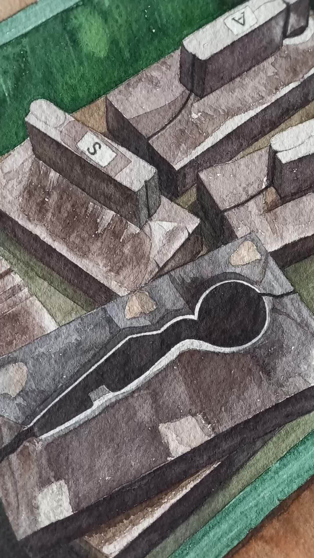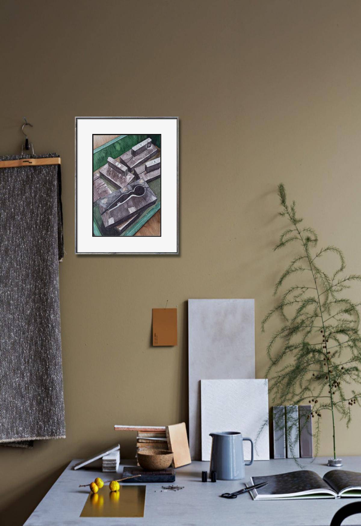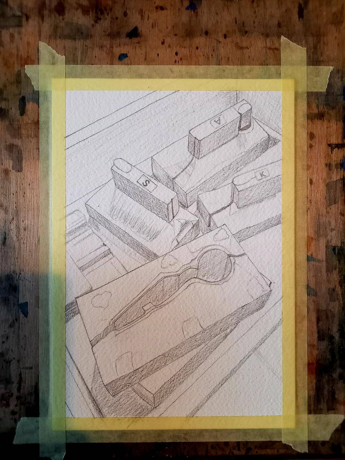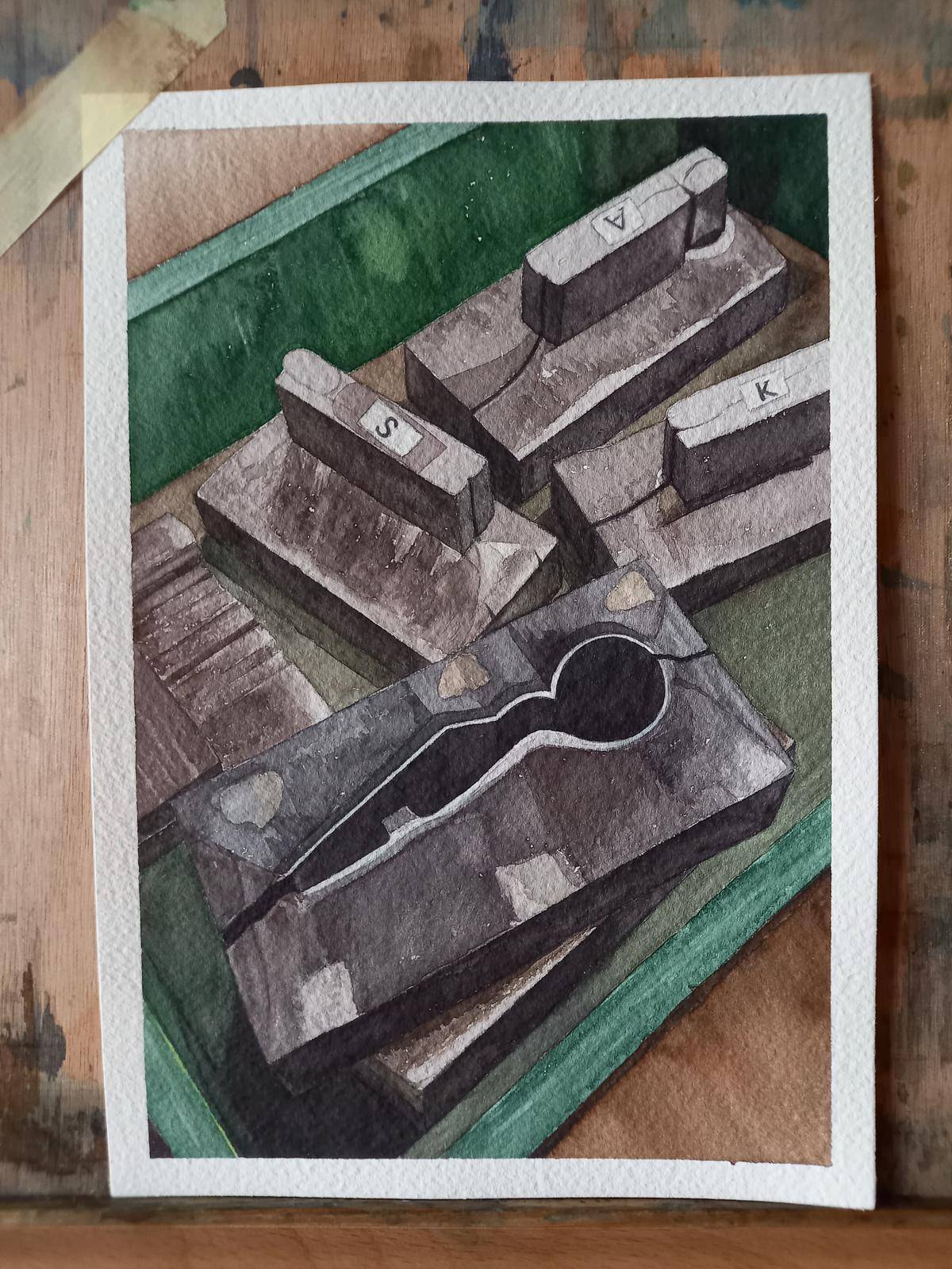 画作致敬德国制造的工匠精神。Solingen ,世界知名的刀具城,大家耳熟能详的德国刀具双立人就来自这里。这幅锻造模具图来自于在本地的刀具工厂博物馆 Schiefestift und Scherenschlägerei 。对于一把德国刀具的制作过程,制造模具并锻造刀具雏模,是德国制造的第一步,每一块模具可以承受2500次锻压,真正的千锤百炼。