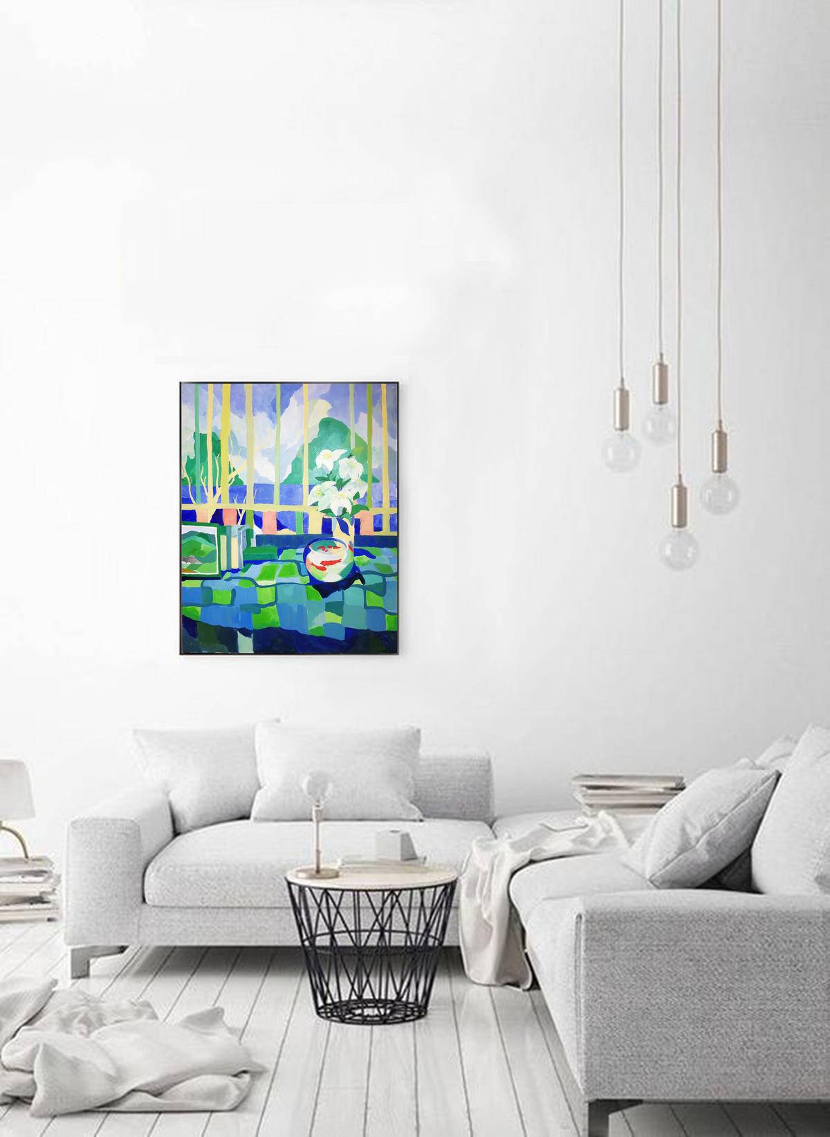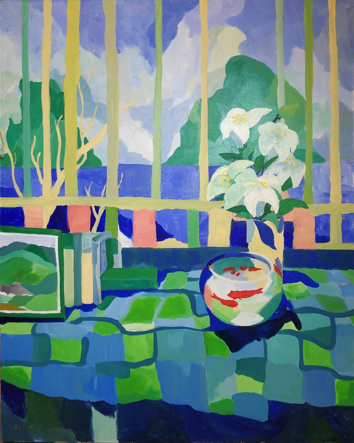 创作此作品时我迷上了格子布,正在尝试用格子布的特性来探索画面色彩的应用,正好窗外有一片蓝色的屋顶,我便将屋外与屋内的两个空间联系起来,虚构了一个不存在的窗前风景。