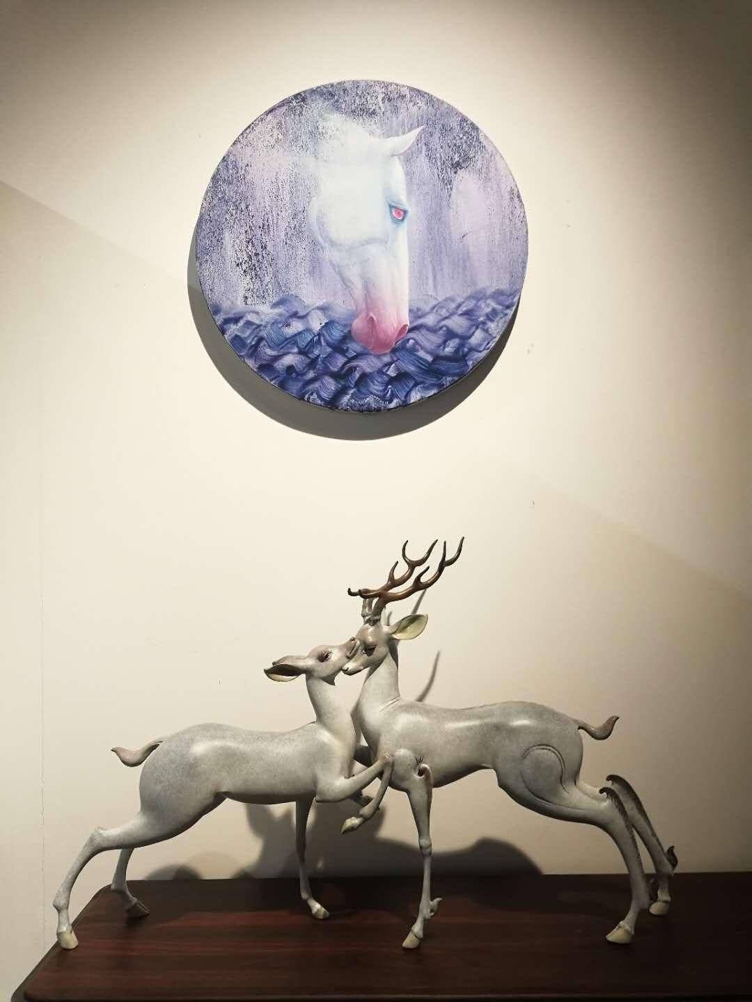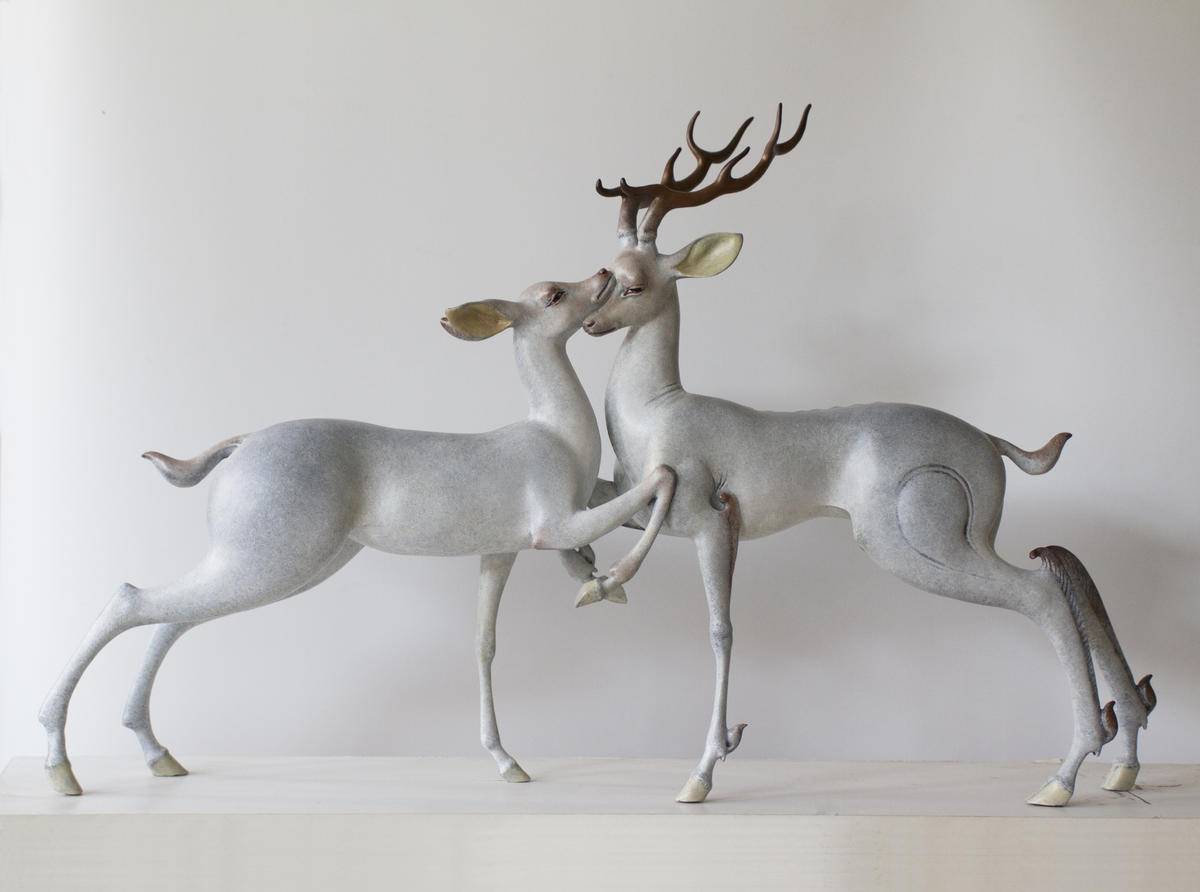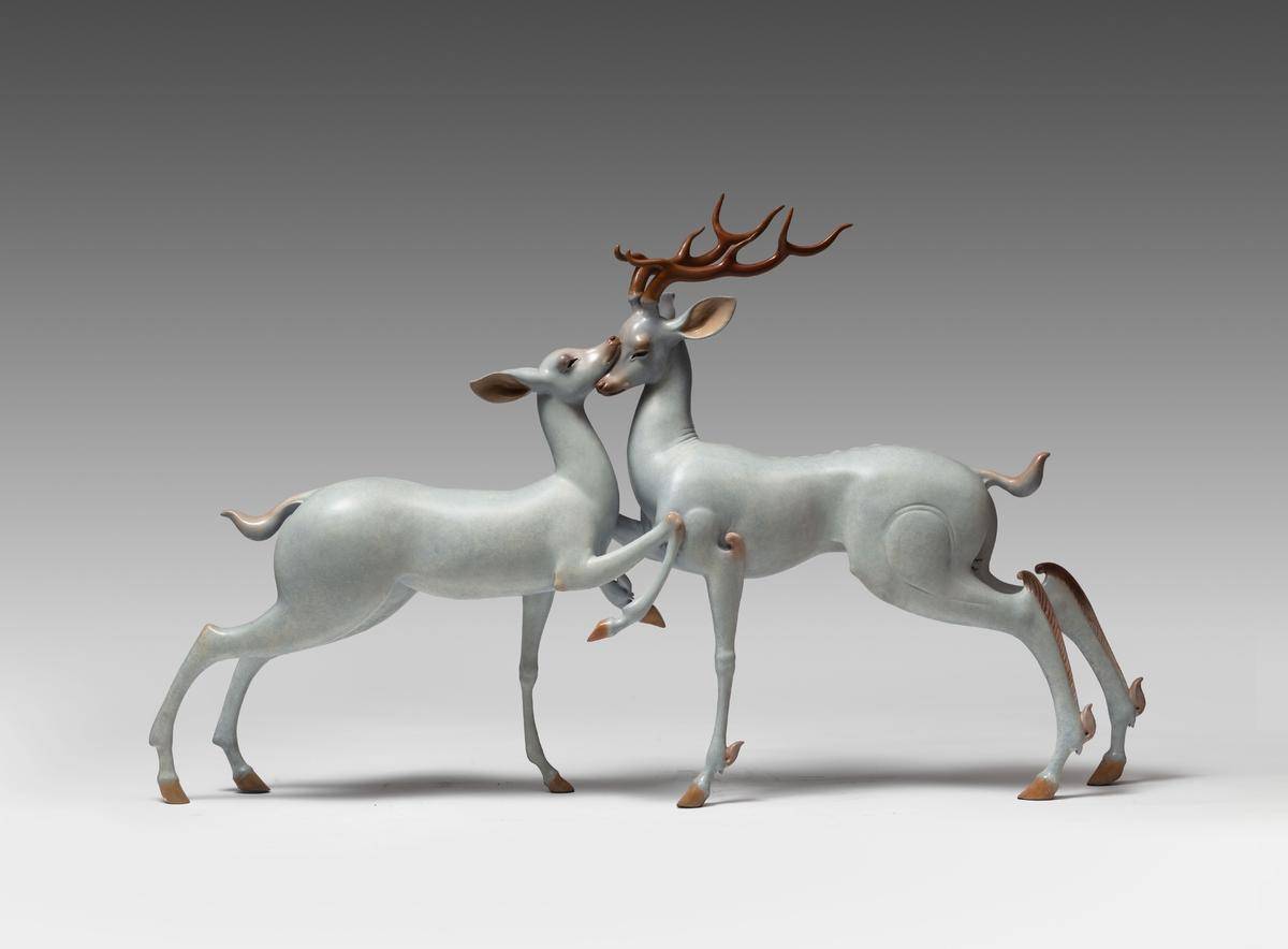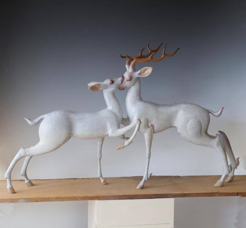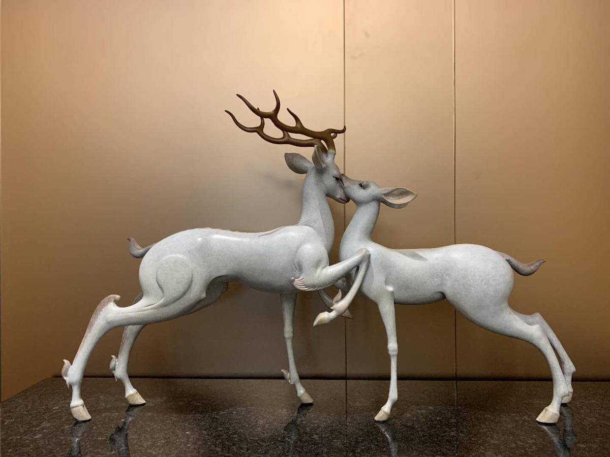 《琴瑟和鸣》这件作品,表达的是某种情感。不管是哪一个时代,无论战乱或和平、无论贫瘠或富有,上至帝王将相,下至贫民走卒,所有人对温情的渴望从来没有消失过。不管是高居地球生物届主宰地位的人类还是其他千百万种动物。对家庭,对亲人,对朋友,都会有一种需要,也都有一份心灵的寄托。这也是几千年来从不过时的一个话题和创作素材。这件作品表达的是两只鹿温柔相拥的一瞬间。头抵着头,前臂环绕,是最温暖的一瞬间。是亲情抑或是爱情?可能需要观众加入自己的理解。