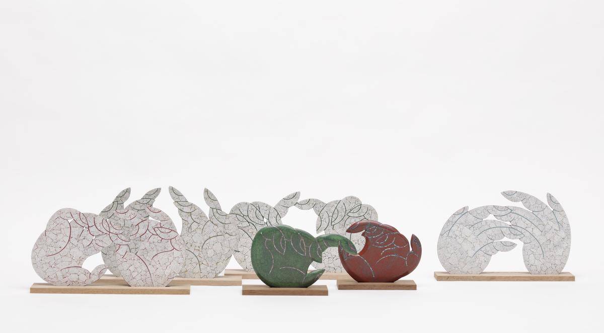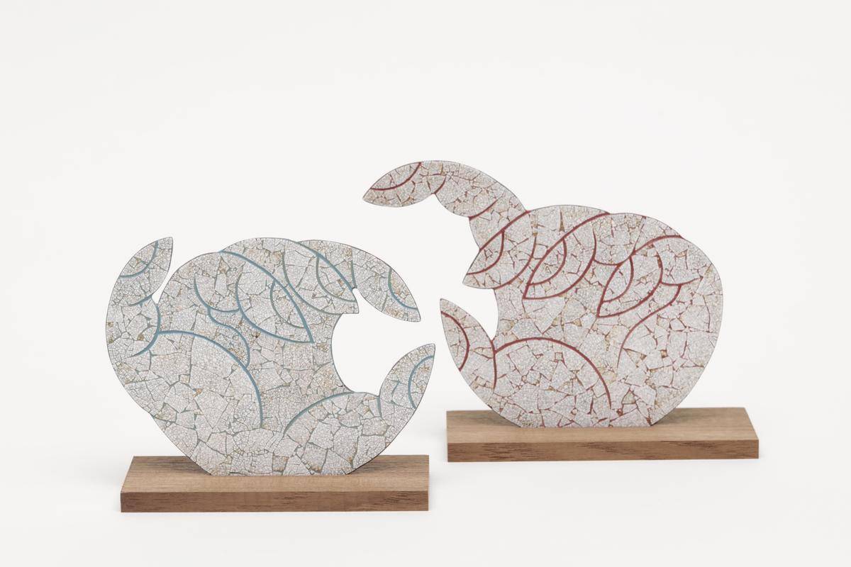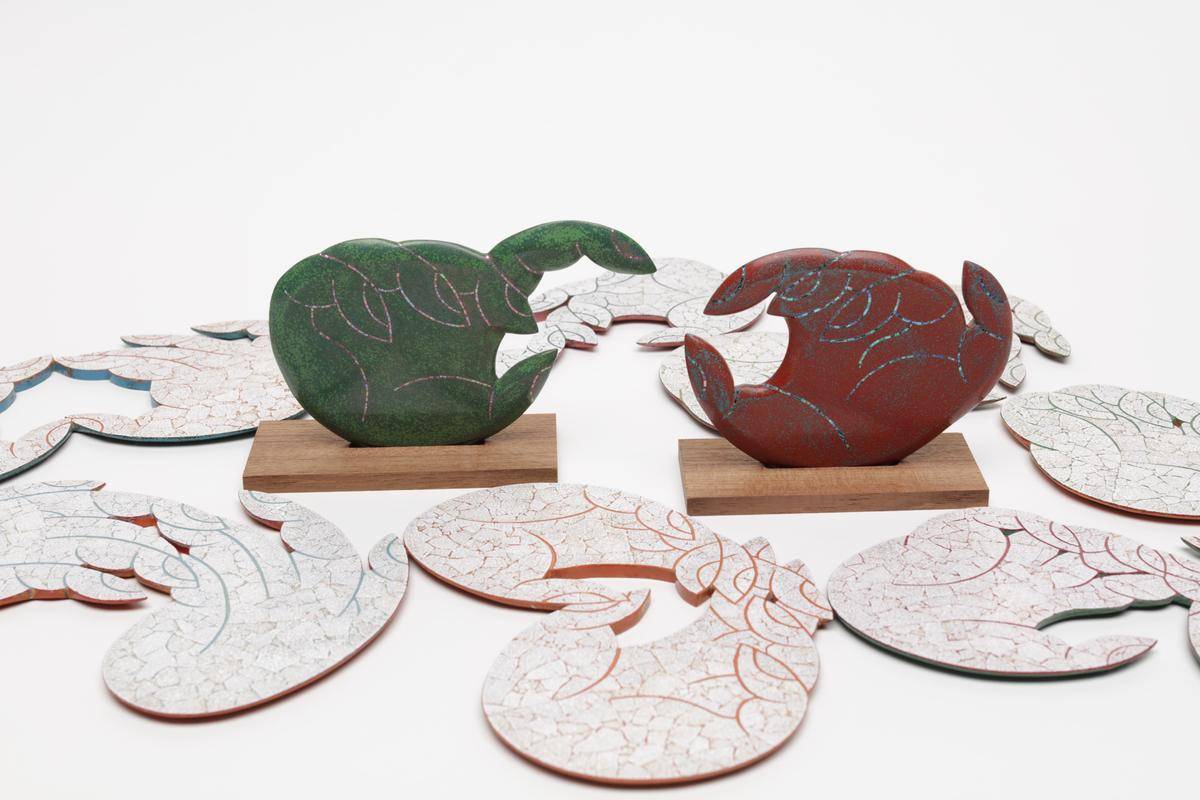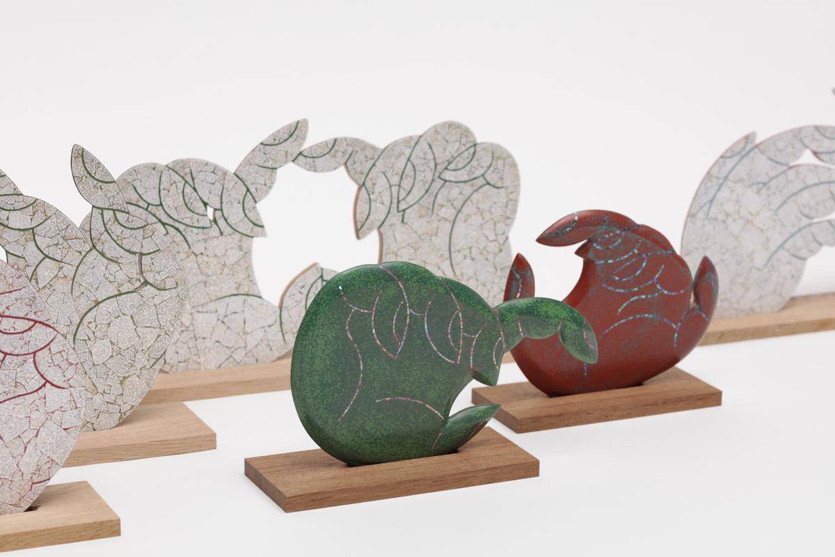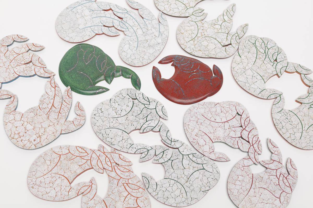 手一直是我的作品表现主题。我做了八双手,用不同漆艺技法材料的镶嵌制作了可变换的两面,以表现对转换的 “Gender” 的隐喻。一面是雪白的蛋壳,线条填以颜色;一面是彩色的色漆,螺钿拼出曲线。