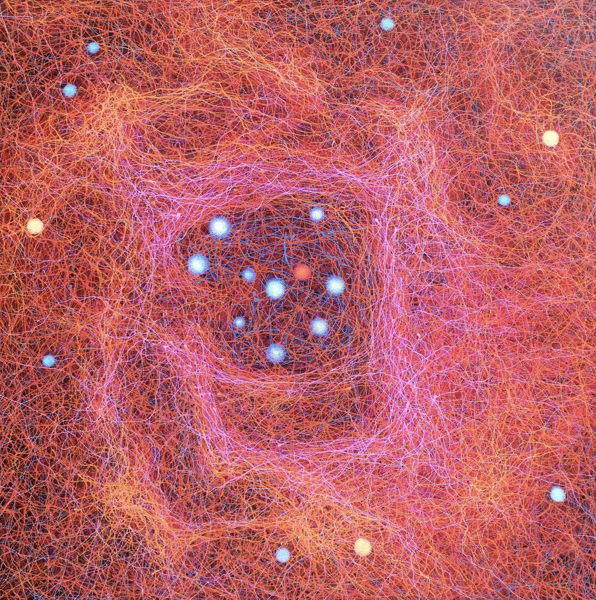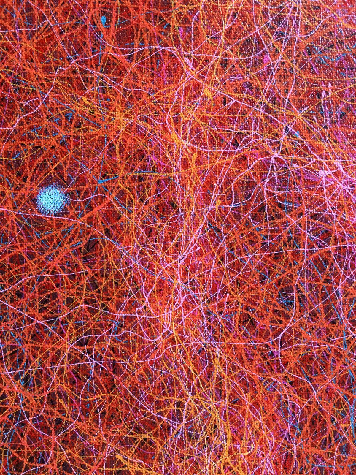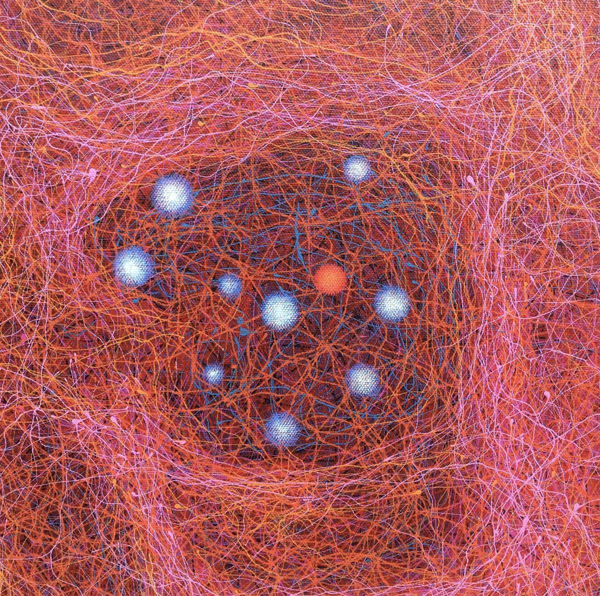 画成现在这样的面貌是我没有预想的,可能源于前段时间作品的延续,源于儿时的记忆,源于无尽的乡愁,源于夜空的繁星,源于纵横的小路,源于起伏的田野和山丘。当一切都变得模糊 而不可捉摸,只化为千丝万缕的思绪,层层叠叠地倾洒在画布上,绵延弯曲,所有的物象归于思线,所有的美好幻化成彩色,还有那闪烁的星星,或明或暗,挥之不去。