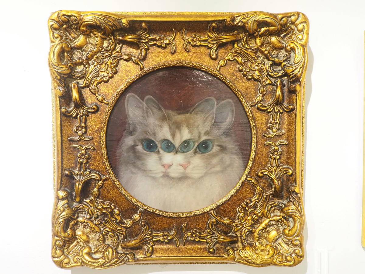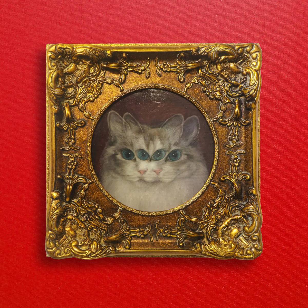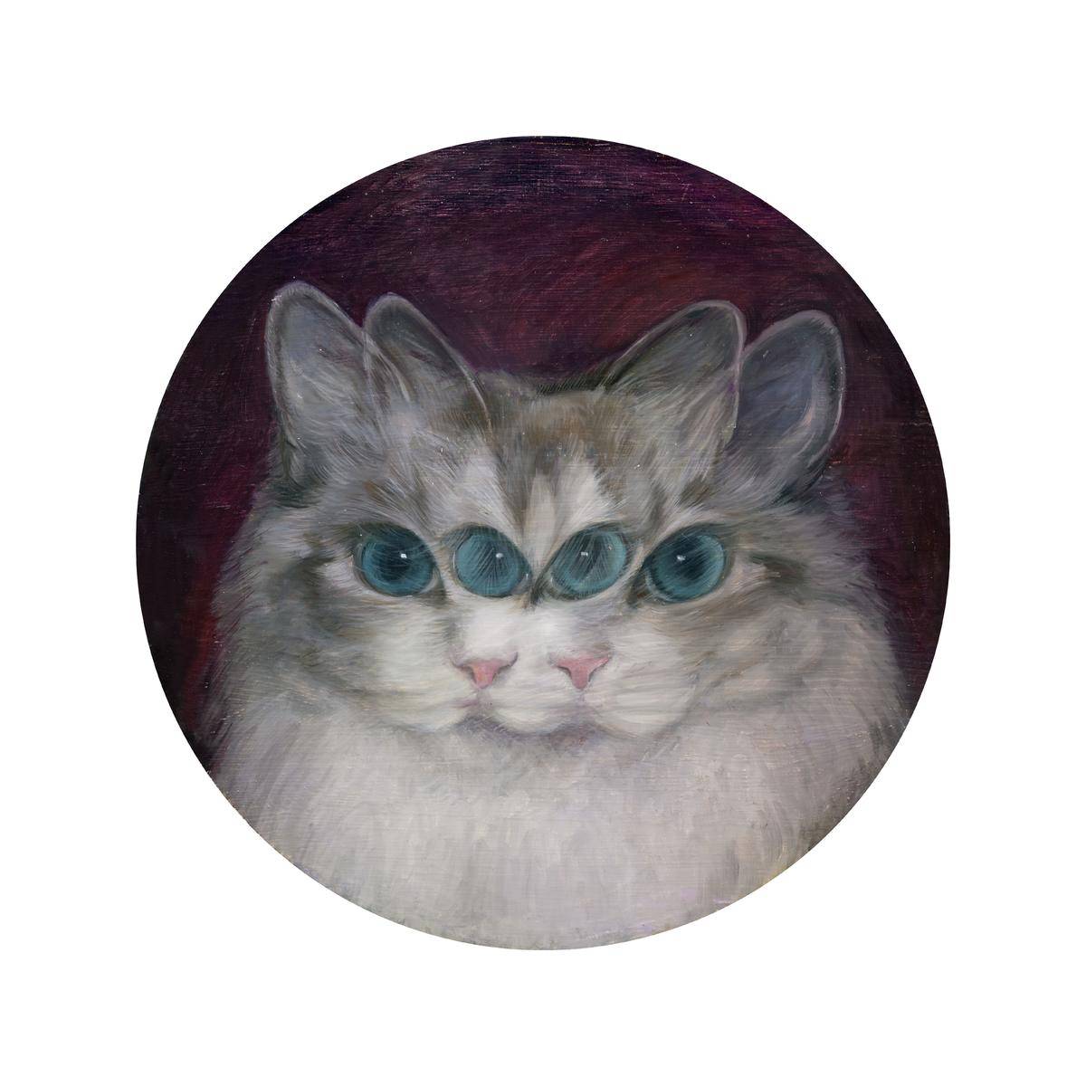 画中的猫是我养的一只母布偶猫。 每天面对它们, 当我在高度焦虑紧张的状态时转而进入一种恍惚迷离的状态, 导致看到猫重叠的效果 ,从而进入一个惑瞳虚幻的世界。 通过我的幻想和现实的差距 ,我需要用视觉效果来感受我我与宠物之间的那种孤独感、 无力感以及游离于主流之外的边缘感。“现代人”在难以把控的人际关系中颠沛流离 ,心若死灰, 对亲密关系只能敬而远之。 所以猫作为一种“亲人”避免了现实中关系的冲突于断裂 。猫的一生的“灵魂”只有主人。 纯粹而简单信任 承诺、陪伴、和关怀。恰恰满足了现代人对情感较为强烈的占有、控制和支配权。