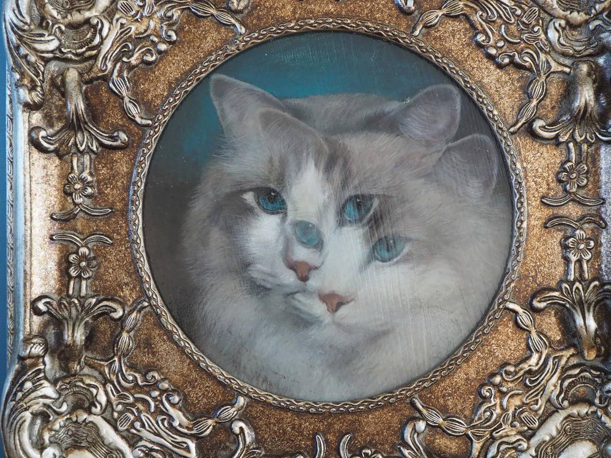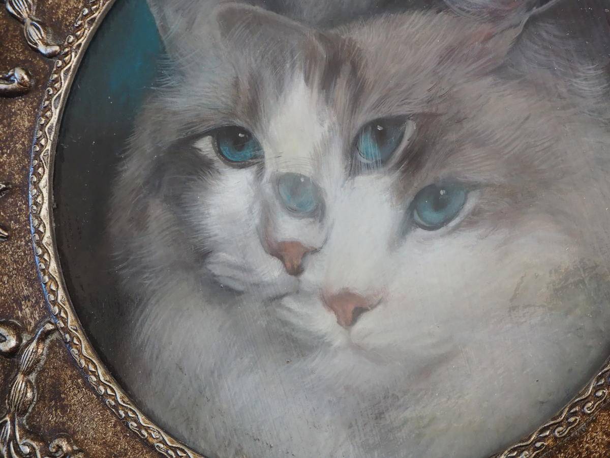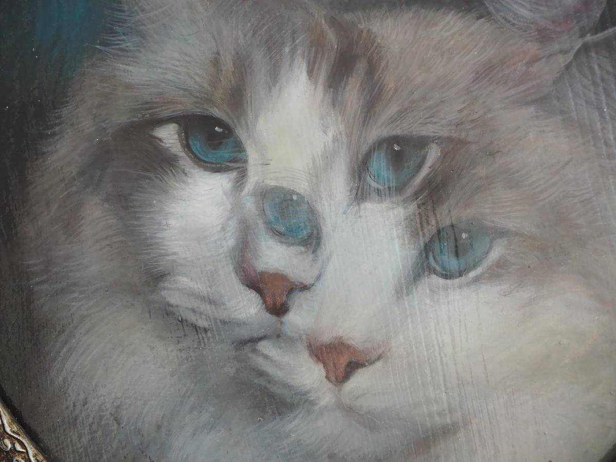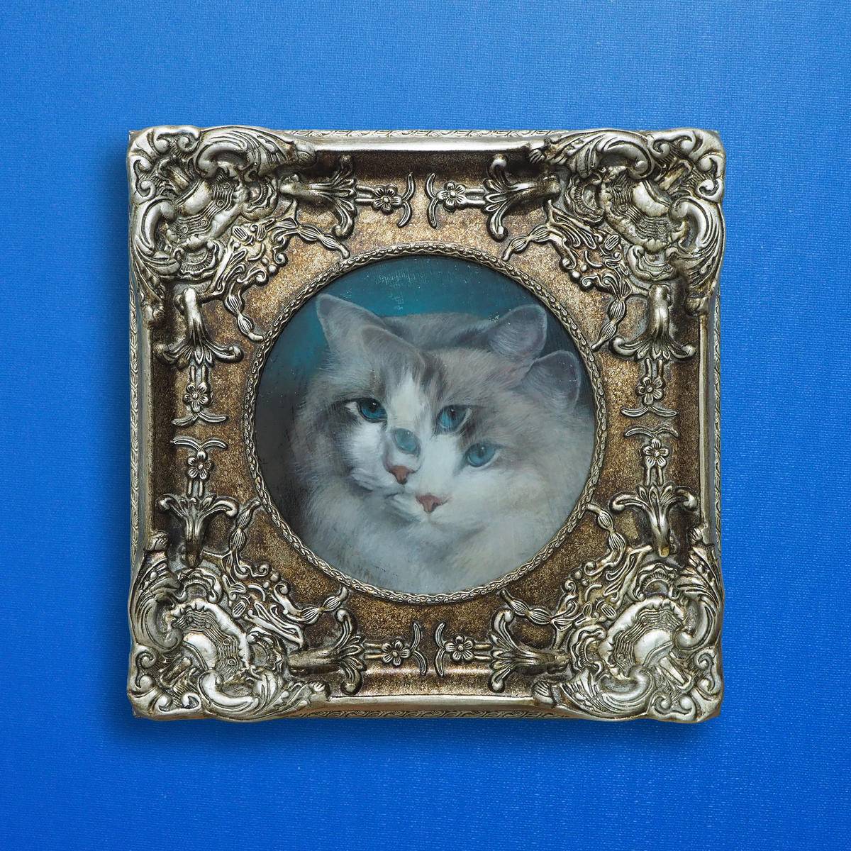画中的猫是我同学养的一只 公布偶猫。叫嘉儿 每天面对它, 当我在高度焦虑紧张的状态时转而进入一种恍惚迷离的状态, 导致看到猫重叠的效果 ,从而进入一个惑瞳虚幻的世界。 通过我的幻想和现实的差距 ,我需要用视觉效果来感受我我与宠物之间的那种孤独感、 无力感以及游离于主流之外的边缘感。“现代人”在难以把控的人际关系中颠沛流离 ,心若死灰, 对亲密关系只能敬而远之。 所以猫作为一种“亲人”避免了现实中关系的冲突于断裂 。猫的一生的“灵魂”只有主人。 纯粹而简单信任 承诺、陪伴、和关怀。恰恰满足了现代人对情感较为强烈的占有、控制和支配权。