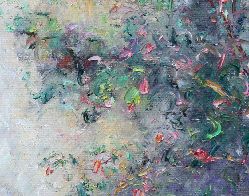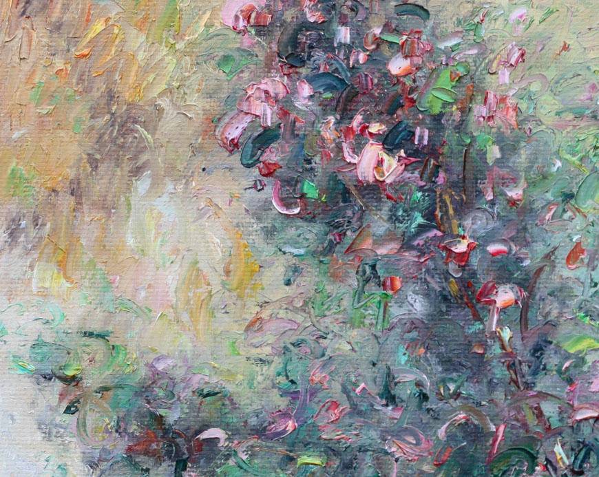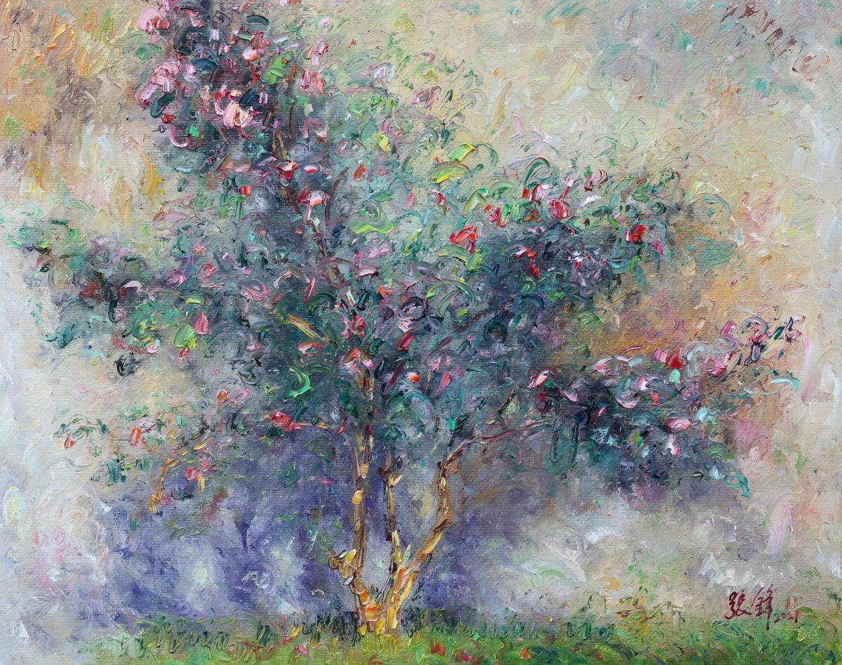 拍卖记录:布面油画《春色满园》80*80cm,拍卖成交价17300元,2015年12月20日,中拍国际,雅昌可查记录。