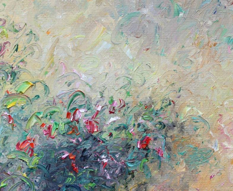 张锋出牧风景油画,多以山水风景为主,他的作品每每给人春意盎然、感染人心的艺术效果,阳光散漫而温暖,色彩优美艳丽,景色朴实无华流畅大方,笔触轻松细腻,层次鲜明,艺术个性突出,象征着大自然富足美好的寓意,有着期盼和谐幸福的意思,在整体画面表现上,细致精美,画面充满动态活力与生趣,呈现出舒适闲散感人的艺术表现力。在他的作品中多数表现那些简单的朴实无华的向日葵,轻轻的河水,淡淡的幽草却呈现出令人心弦震荡的灿烂辉煌,而在读者的眼中那些黄色和棕色调的色彩以及技法表现出充满希望和阳光的美丽世界,那更是我们所向往,所迷恋的精神家园。由此可见作者的热情、以及对生活积极向上的态度,没有这样的激情,我认为是创作不出这样感人的作品的。