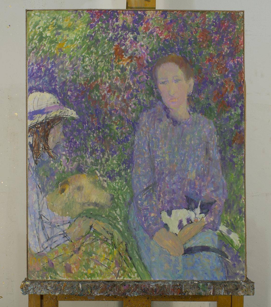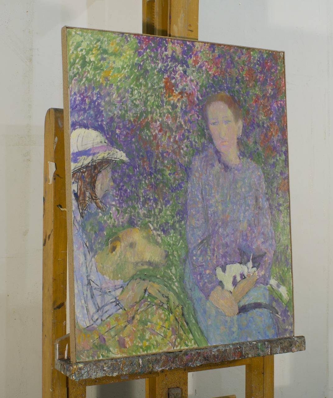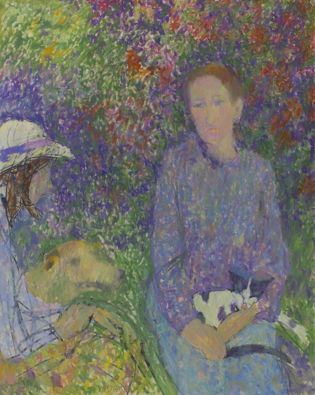 这幅画是在俄罗斯画的。 它描绘了两个美丽的女孩。 他们坐在树荫下的花园里。 他们旁边是他们的宠物,一只狗和一只猫。