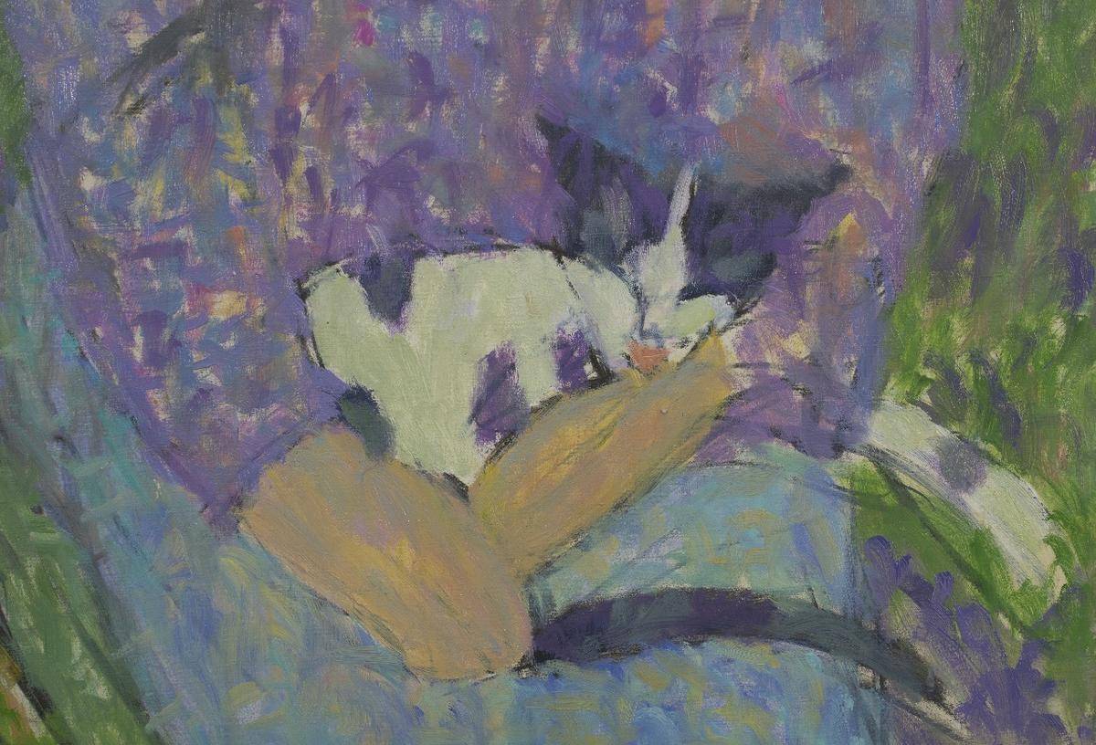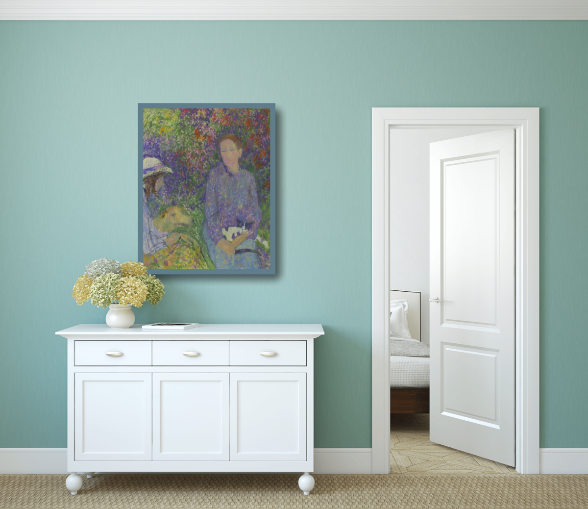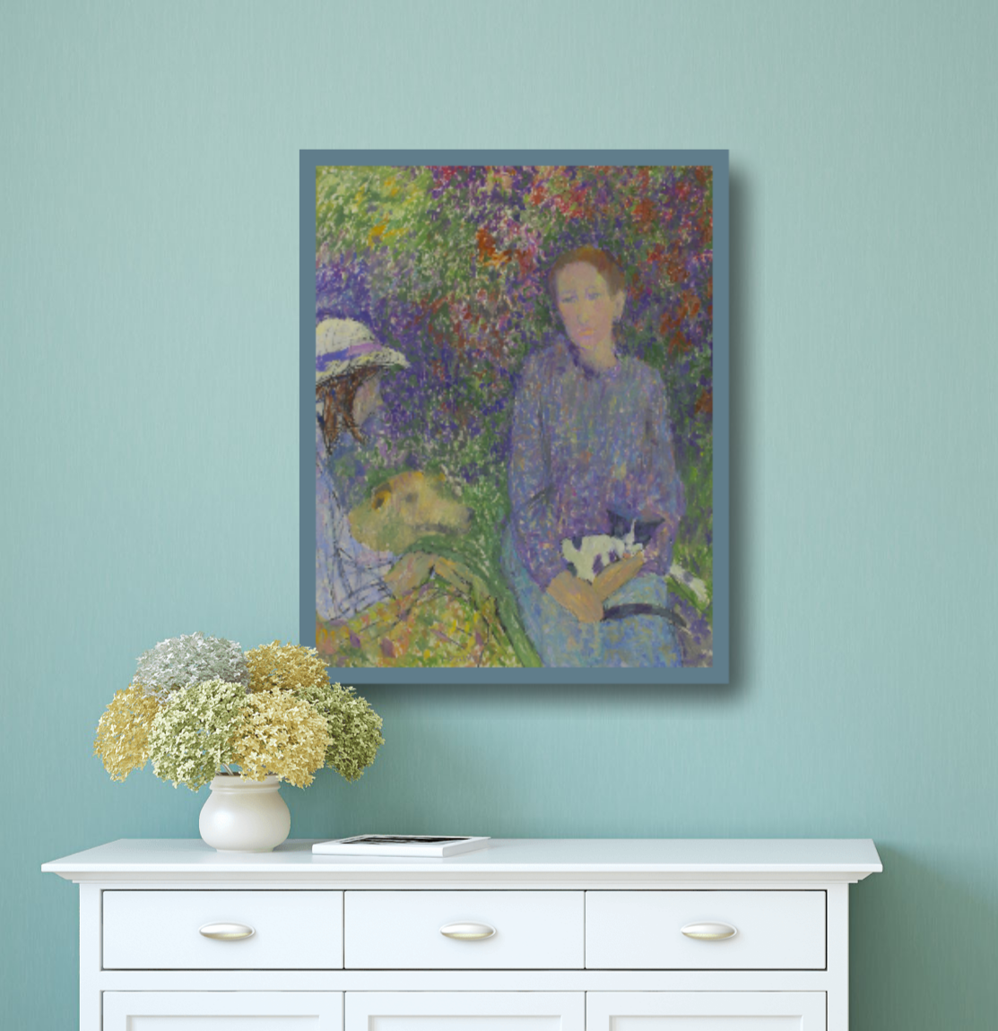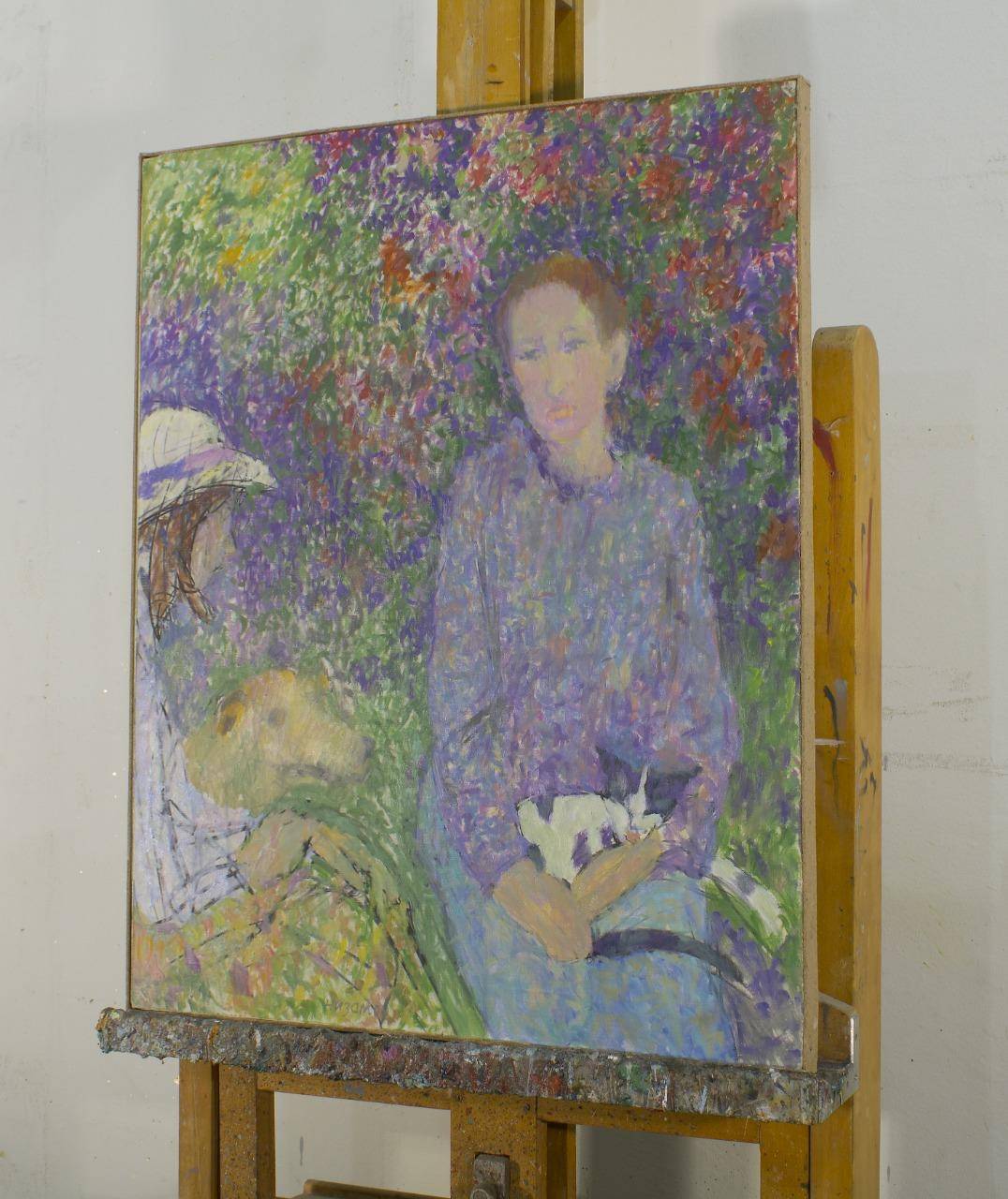 这幅画是在俄罗斯画的。 它描绘了两个美丽的女孩。 他们坐在树荫下的花园里。 他们旁边是他们的宠物,一只狗和一只猫。