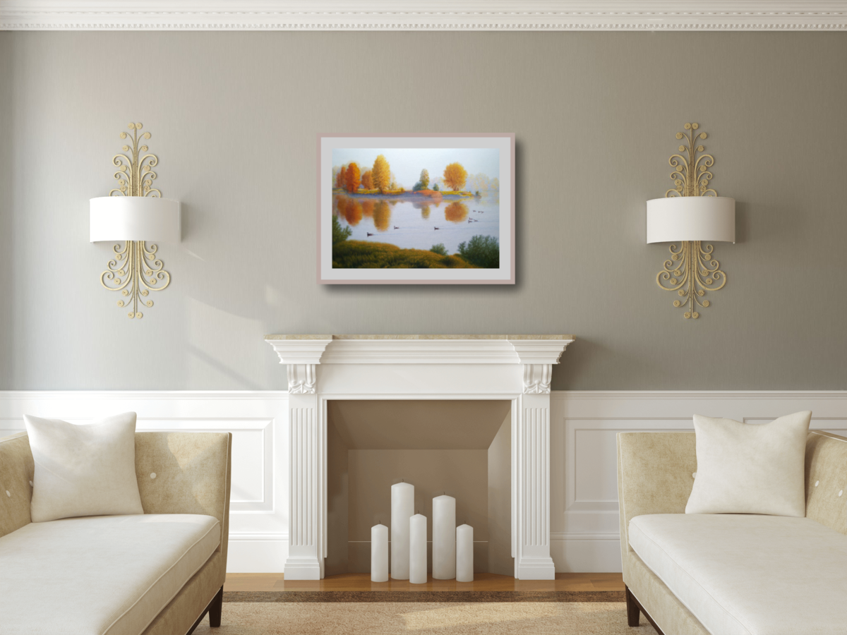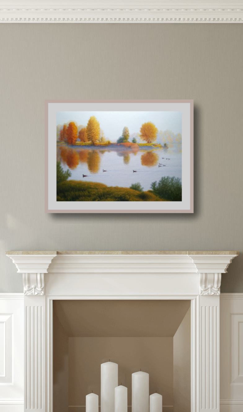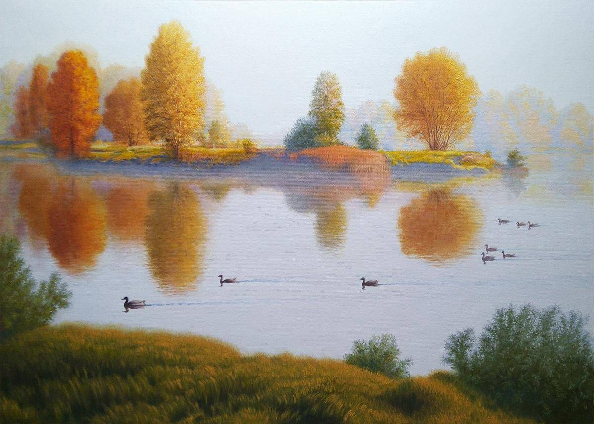 这幅画是在俄罗斯画的。它描绘了一个安静的早晨,雾在湖面上蔓延。野鸭在湖上游泳。艺术家尼扎莫夫罗伯特。