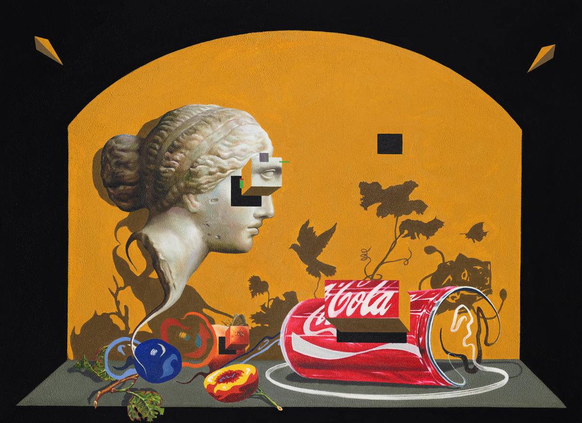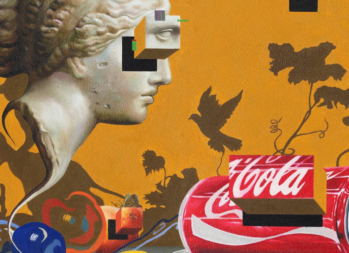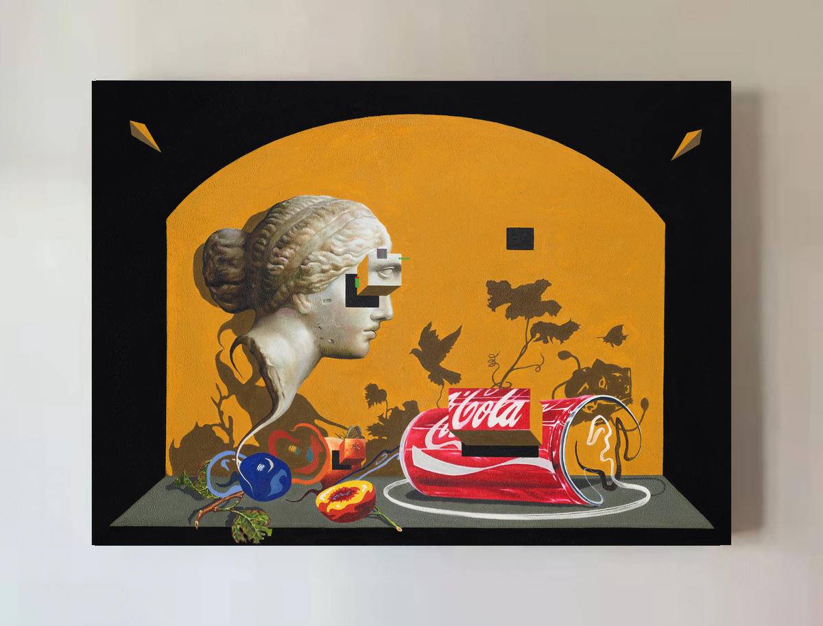 阿佛洛狄忒的雕像(爱情,美丽,性爱女神),可口可乐(令人上瘾的消费主义品牌)的空易拉罐,若隐若现的水果(食欲,富裕的象征),妙蛙种子的影子(潮流文化的符号),是虚是实,令人上瘾,过后又留下什么,还是只是虚物。