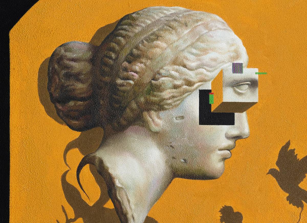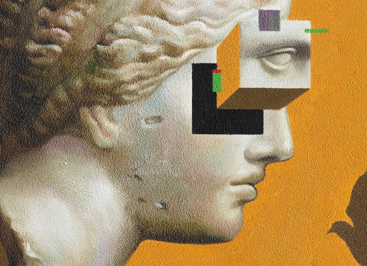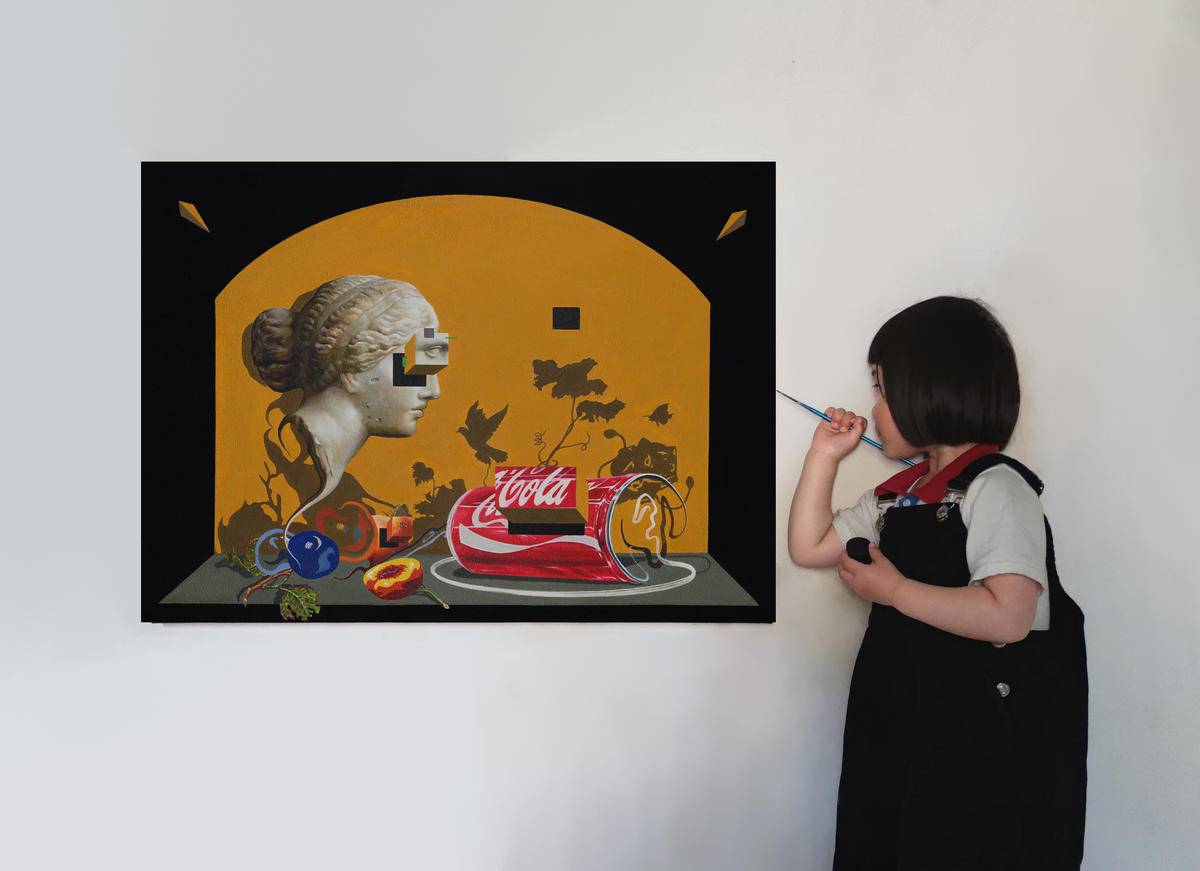 阿佛洛狄忒的雕像(爱情,美丽,性爱女神),可口可乐(令人上瘾的消费主义品牌)的空易拉罐,若隐若现的水果(食欲,富裕的象征),妙蛙种子的影子(潮流文化的符号),是虚是实,令人上瘾,过后又留下什么,还是只是虚物。