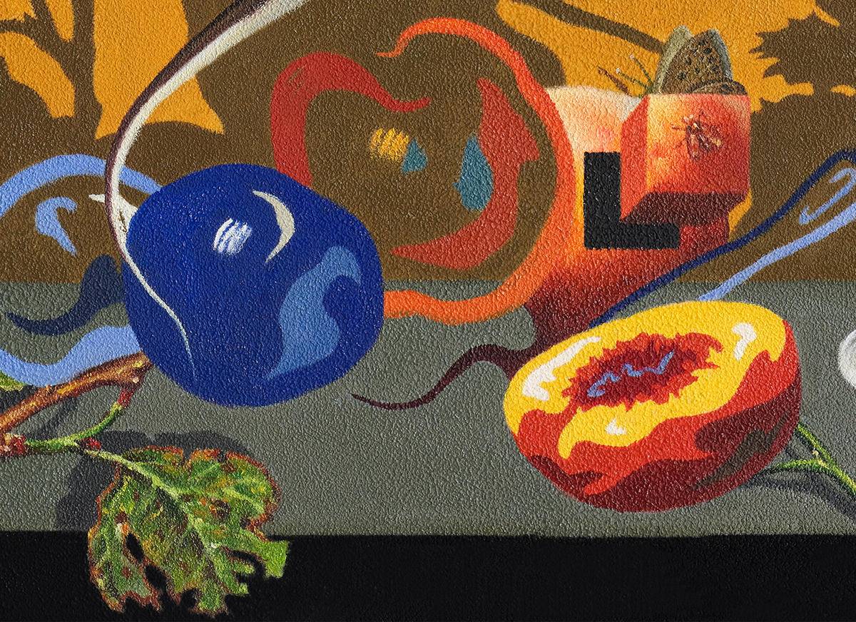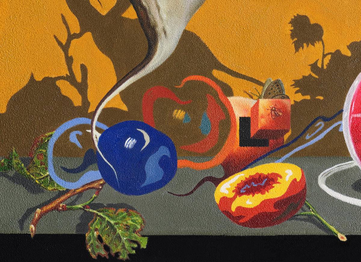 我将文字解构再造形成stil lifanitas -虚 物。画面解构出当代图像景观的虚无感。画面中的静物是实体吗,是画,还是图像,还是只是个投影,还是画笔下的线条和图案。我们从康德那里知道“物自体”的不可知性,一切皆为现象。我仍然对图像现成品进行解构再造,由对图像的虚无感隐喻对现实现象的虚无感。当代静物画逐渐沦为行画或形式主义装饰,我想从静物这个传统题材出发,做形而上的当代表达并兼具装饰性。鸽子是圣灵的象征,在这里去隐喻人的精神性,精神意识是虚无,无实体的却是我们唯一确定感受的,现象物质是实存的却又困于现象。画面增加厚肌理处理,增加物质性,去表达精神与物质,存在与虚无之间的关系与矛盾。