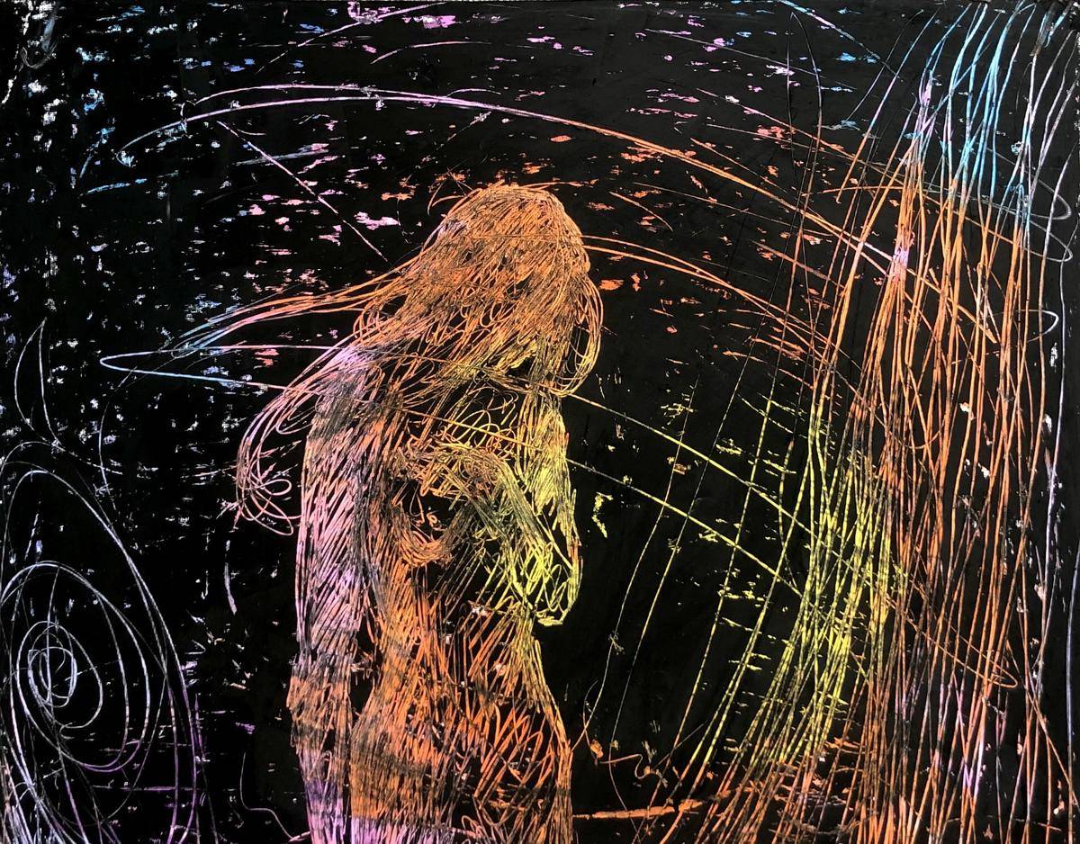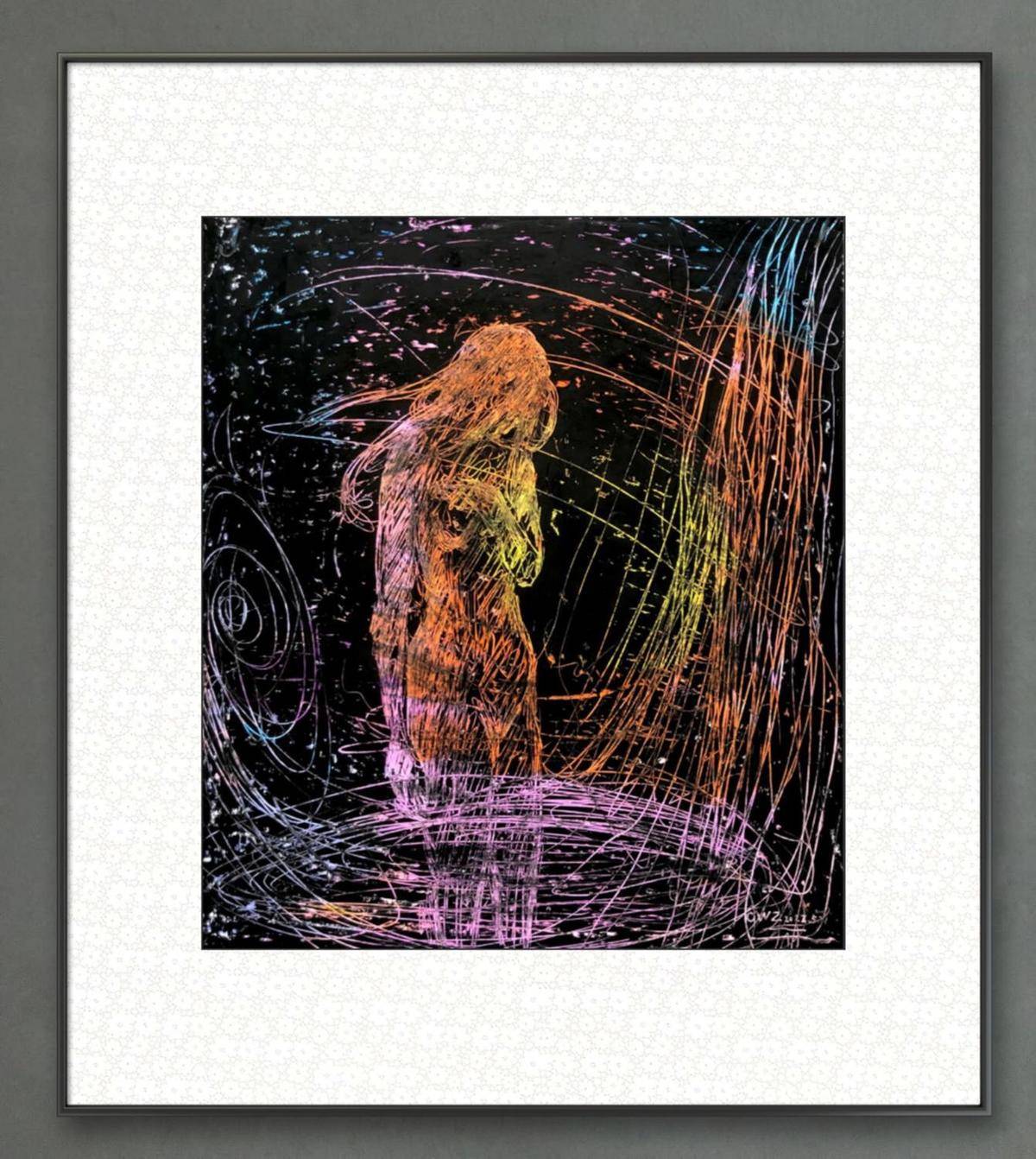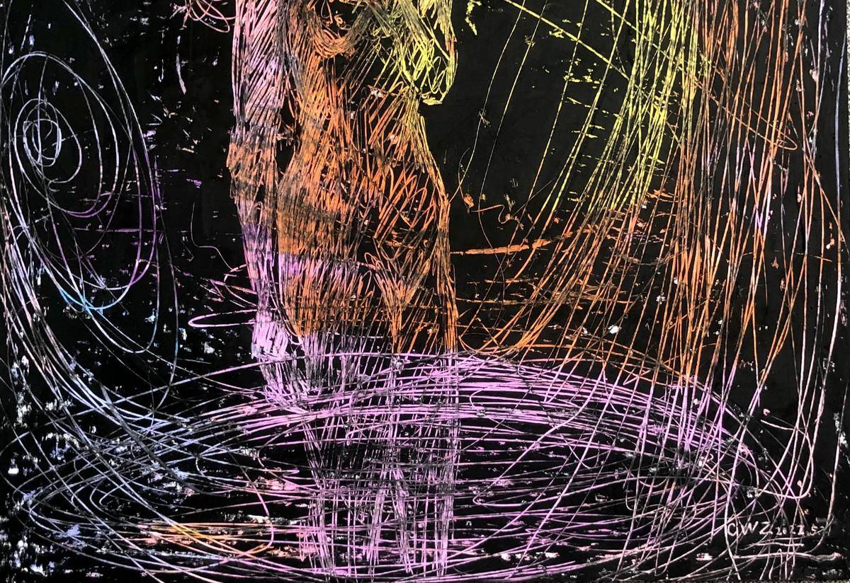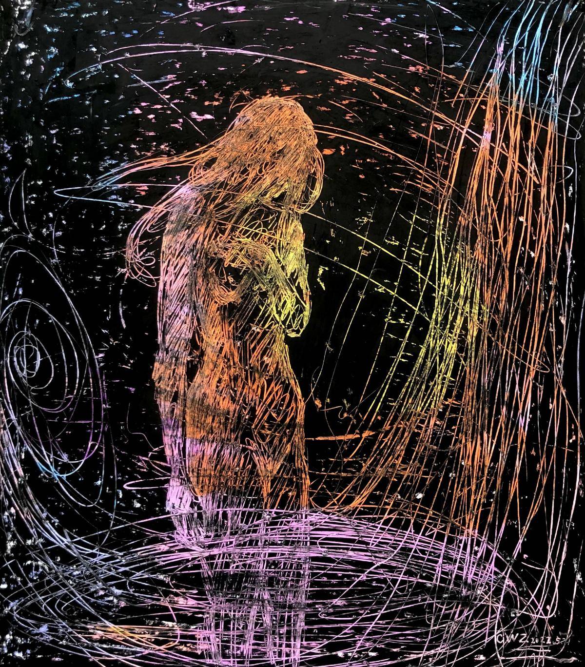 黑色背景衬托出人物的孤独身影,彩色线条如思绪般肆意飞舞、环绕,似内心波澜涌动。人物姿态略显落寞,画作通过独特的线条和色彩组合,生动地表达出人物复杂的内心世界,充满了神秘的艺术氛围。