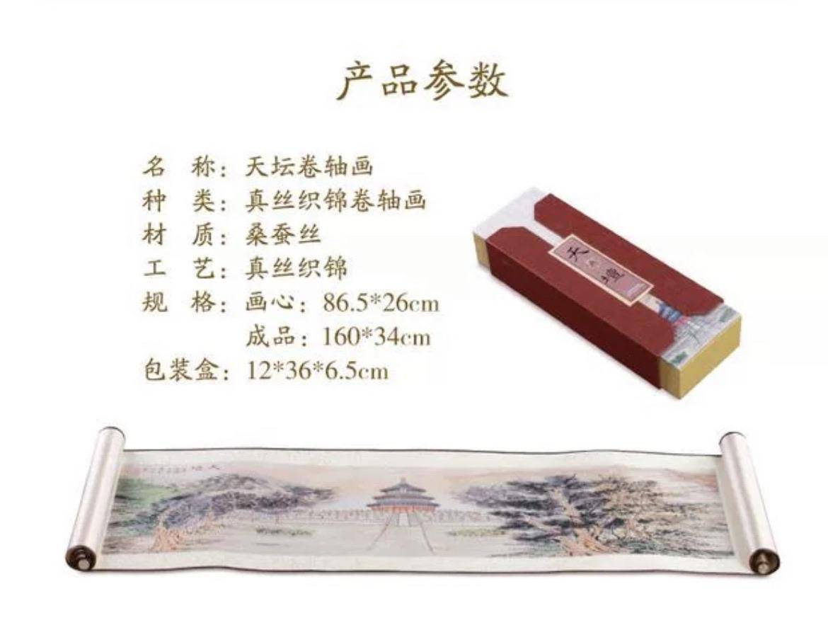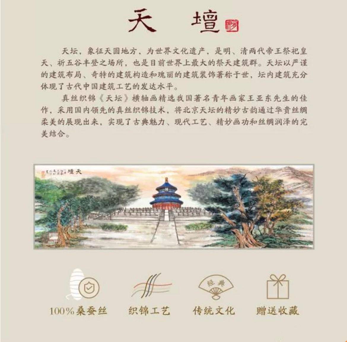 真丝织锦《天坛》横轴画精选我国著名青年画家王亚东先生的佳作。采用国内领先的真丝织锦技术。将北京天坛的精妙古韵通过华贵丝绸柔美的展现出来。实现了古典魅力、现代工艺、精妙画功和丝绸润泽的完美结合。