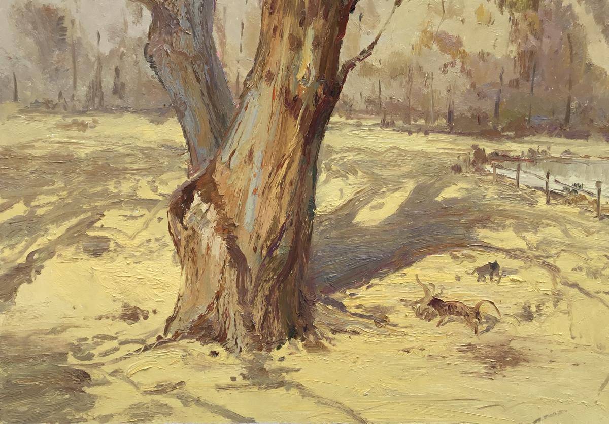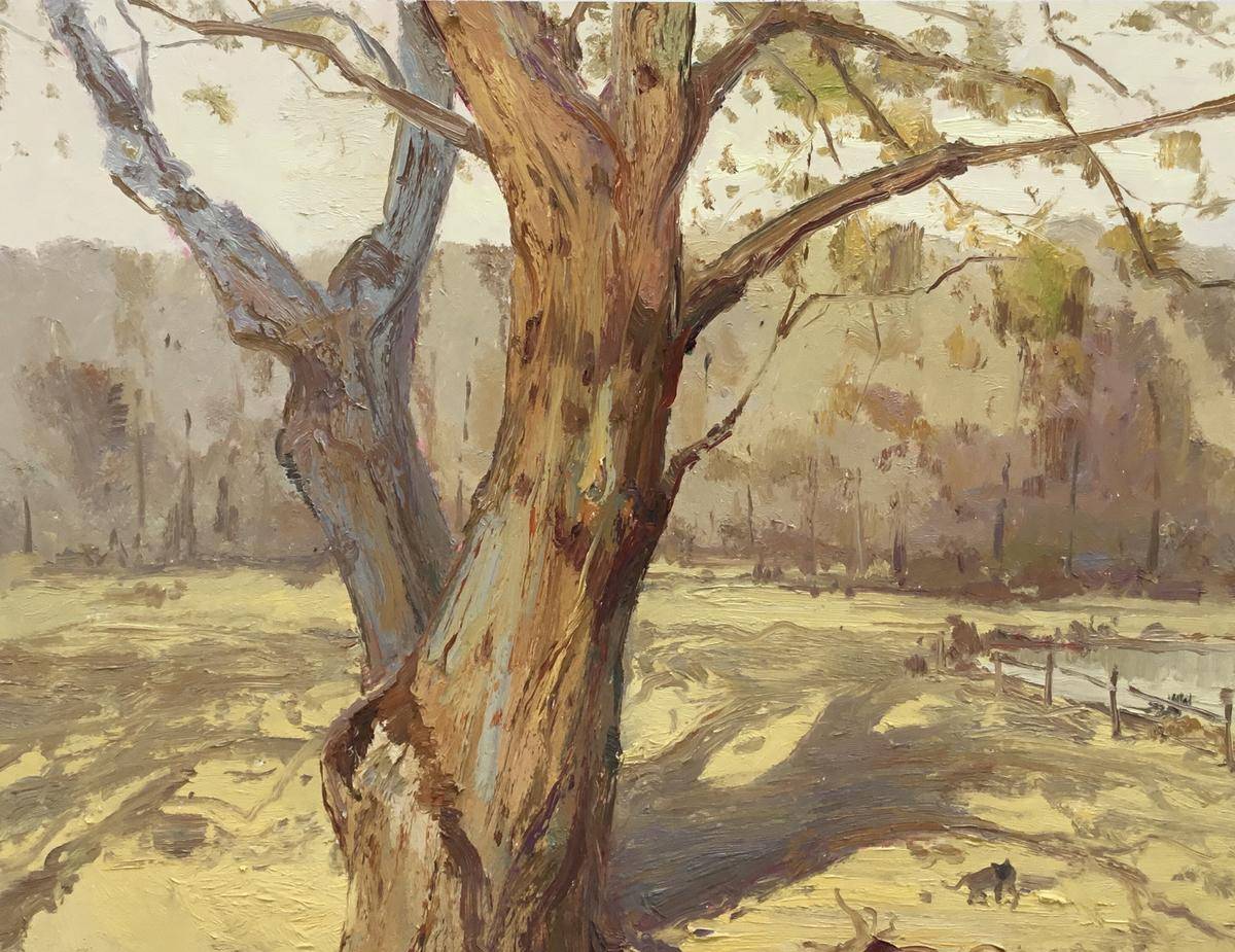 在这片宁静的天地,粗壮的老树宛如岁月的守护者,沧桑的纹理镌刻着时光的故事。稀疏的枝叶在微风中轻颤,似在低语往昔。树下,几只小动物灵动跳跃,为这略显寂静的画面增添了一抹生机。远处的围栏、朦胧的树林与静谧的水面,共同勾勒出一幅恬淡的田园景致,让人的心也随之沉静,沉浸于这自然的诗意之中 。