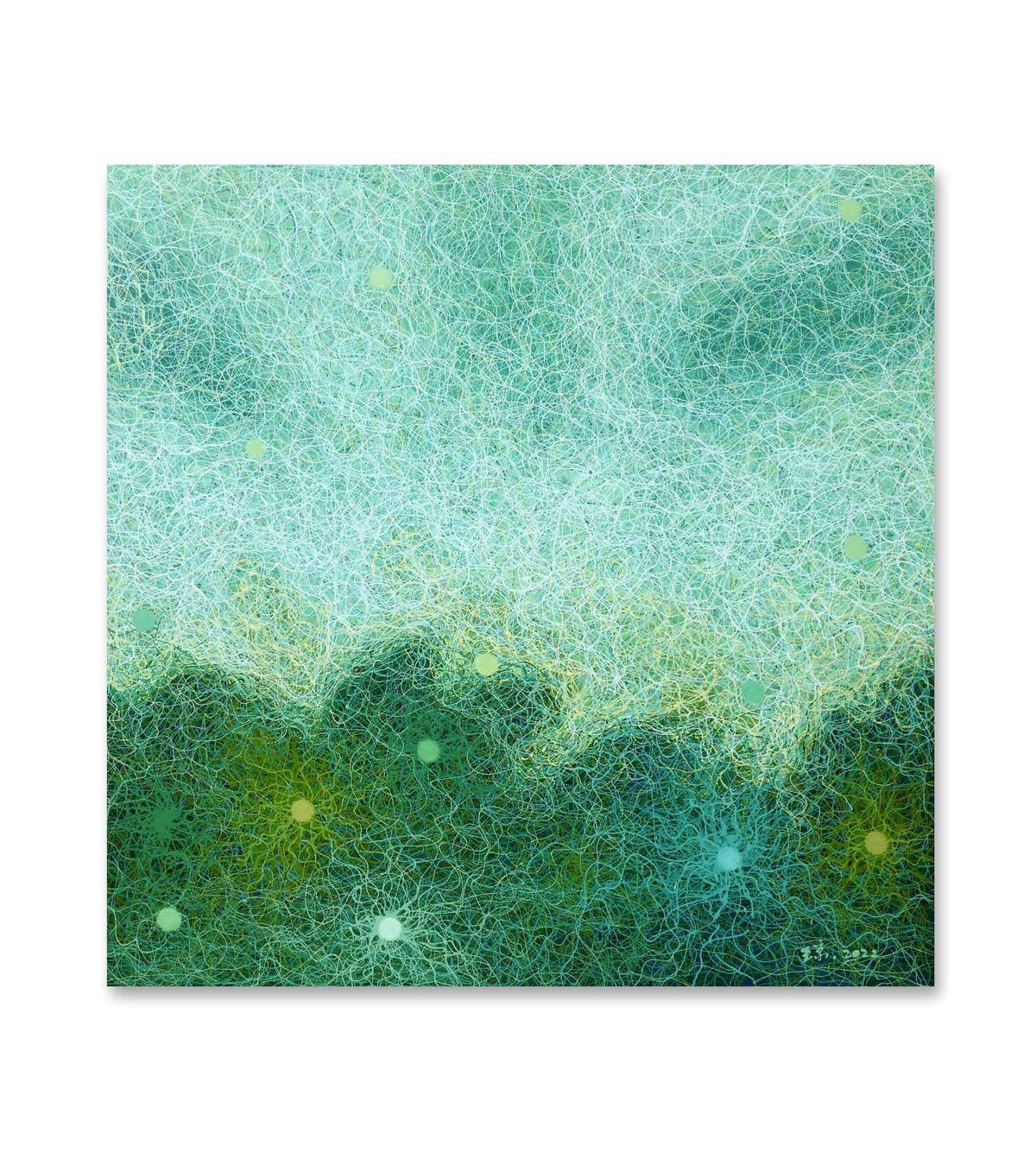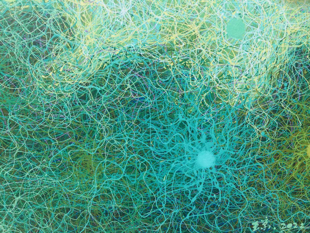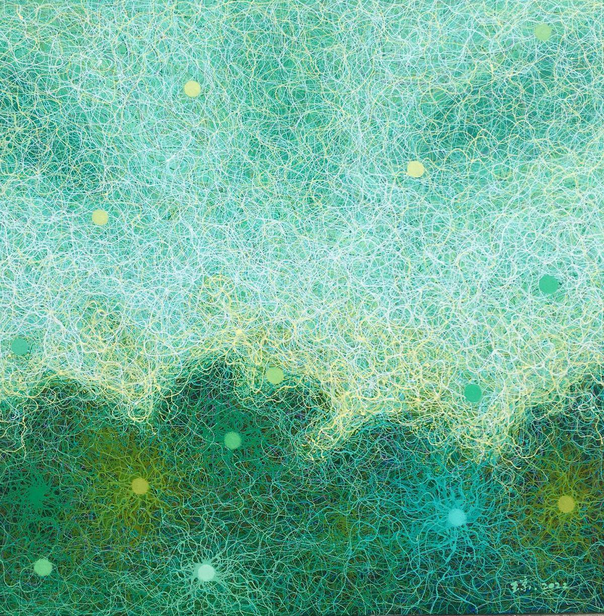 在我记忆的深处:天总是很蓝,云是白的;夜总是很静,还很深邃;星星很多,忽闪忽闪的;路总是很窄,还交错纵横;山也不高,树草杂生;萤火虫遍地,随手就可以抓到。这不是童话,是我们儿时生活的场景。现在都没有了,无论是城市还是乡村。我只能用记忆留住这种美好,当我在创作的时候,闪烁的星星,忽明忽暗的萤火虫,交错纵横的小路,低矮的山丘……总是在脑海浮现,我索性用我的画笔表达这份美好,最初作品那些山丘、田野、小路……都依稀可见,是叙事感的,是抒情的,随着世事的变迁,印象更加模糊,内心也更迷离,最后我把那个阶段的作品更加抽象,把依稀小路中间的一条线抽离出来,把所有的物象都归于这条线,象春蚕吐丝一样密密麻麻,层层叠叠,把所有的物象、情绪,甚至是真像都厚厚地包裹起来,我精致而精心地保藏着我心中的田园丘壑,掩藏着我无限神往的浩瀚星辰,只有那忽明忽暗的星星,挥之不去,却让我们看到别样的视觉,感受到另类的美好。