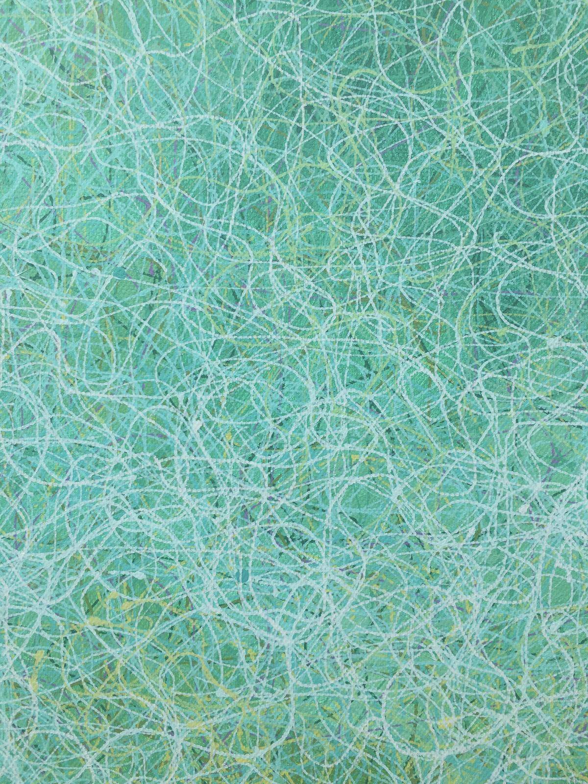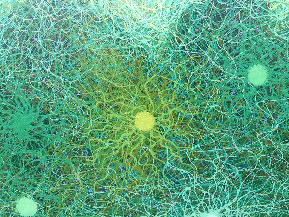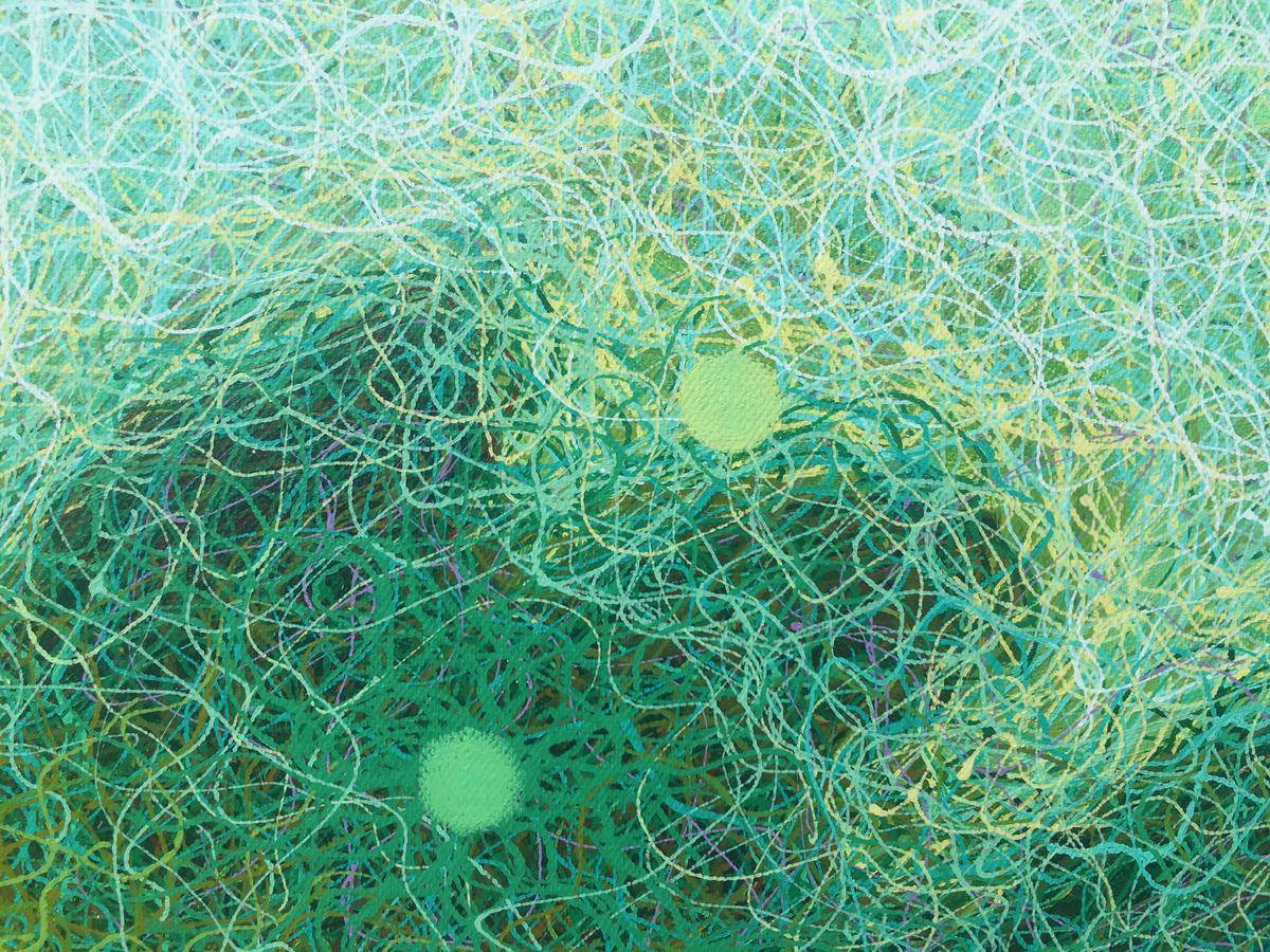 在我记忆的深处:天总是很蓝,云是白的;夜总是很静,还很深邃;星星很多,忽闪忽闪的;路总是很窄,还交错纵横;山也不高,树草杂生;萤火虫遍地,随手就可以抓到。这不是童话,是我们儿时生活的场景。现在都没有了,无论是城市还是乡村。我只能用记忆留住这种美好,当我在创作的时候,闪烁的星星,忽明忽暗的萤火虫,交错纵横的小路,低矮的山丘……总是在脑海浮现,我索性用我的画笔表达这份美好,最初作品那些山丘、田野、小路……都依稀可见,是叙事感的,是抒情的,随着世事的变迁,印象更加模糊,内心也更迷离,最后我把那个阶段的作品更加抽象,把依稀小路中间的一条线抽离出来,把所有的物象都归于这条线,象春蚕吐丝一样密密麻麻,层层叠叠,把所有的物象、情绪,甚至是真像都厚厚地包裹起来,我精致而精心地保藏着我心中的田园丘壑,掩藏着我无限神往的浩瀚星辰,只有那忽明忽暗的星星,挥之不去,却让我们看到别样的视觉,感受到另类的美好。