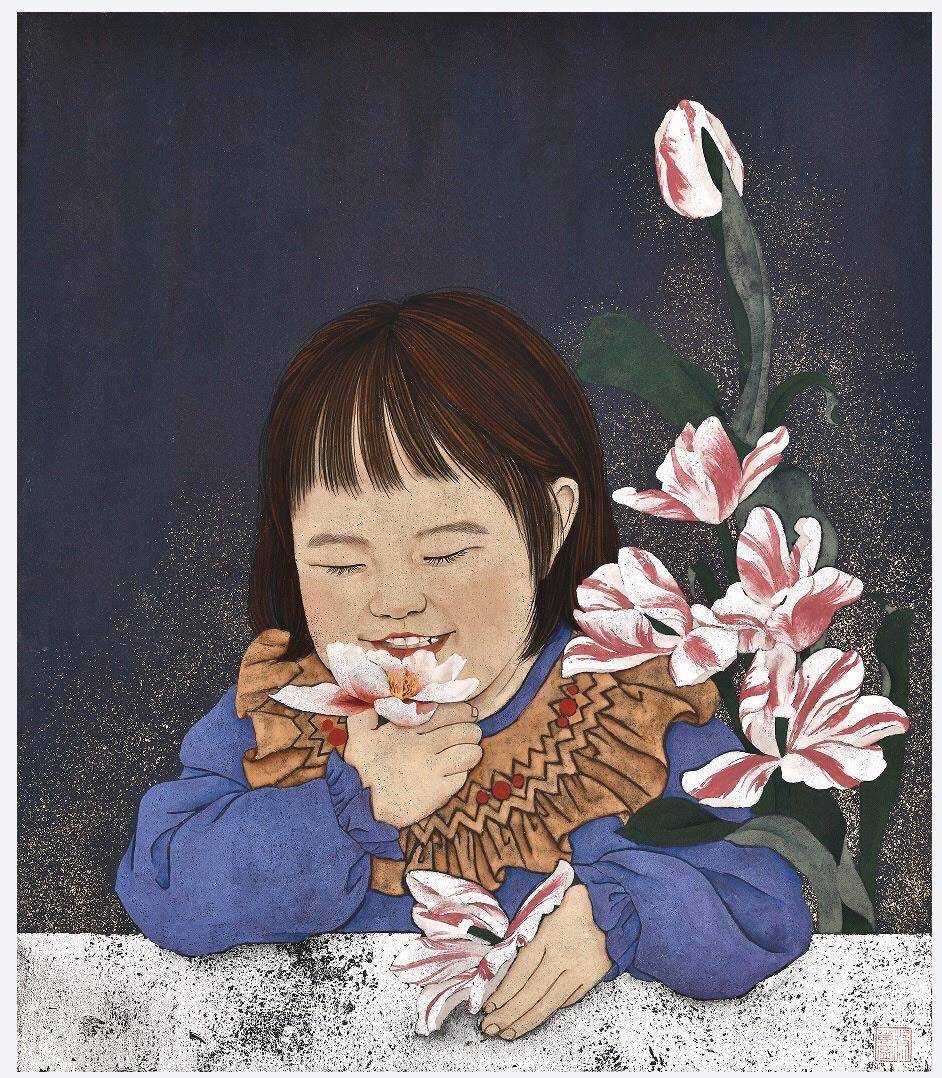 花与女孩系列作品表达了我对童年那种纯真盎然的记忆和感受,我主要以女孩肖像表达为主,以花映衬为辅,烘托肖像所表达的气质、性格。为了凸显画面主体,我没有做过多的画面处理,我想让观者更直接的感受这份挚子童心。