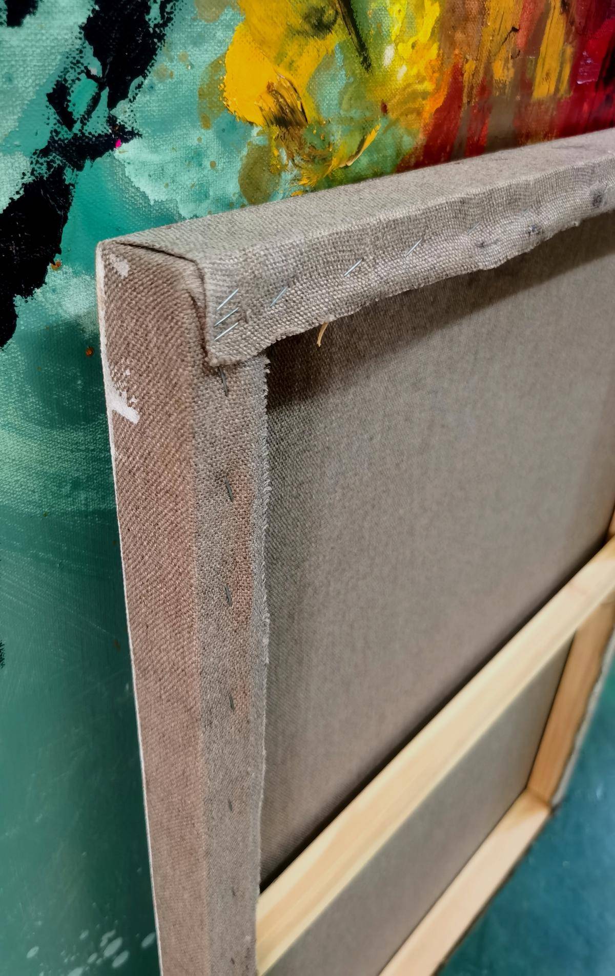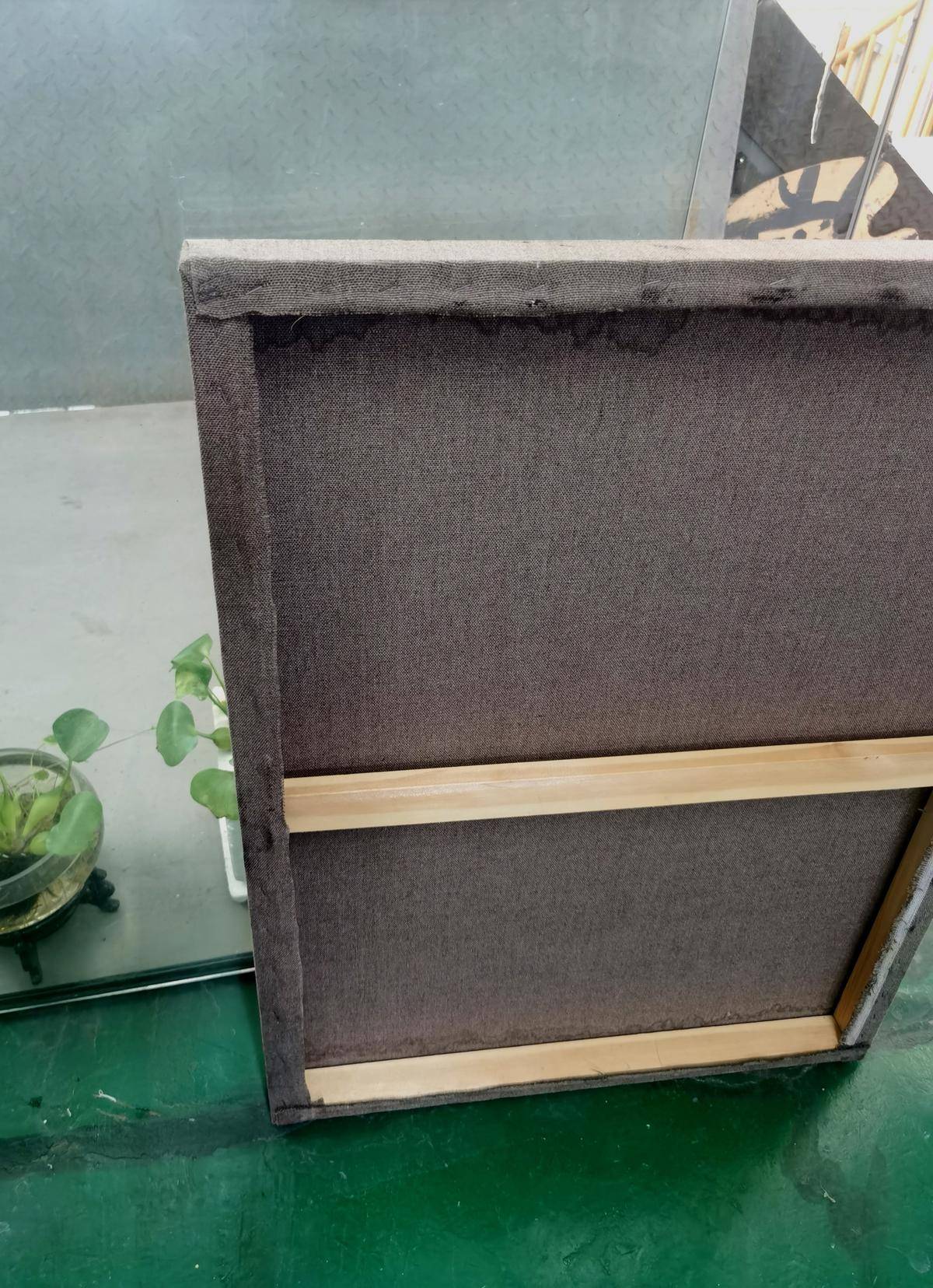 这幅作品 布面用的是 经纬比较紧密的粗纹 深灰雨露麻,立面 白松木 卯榫内框