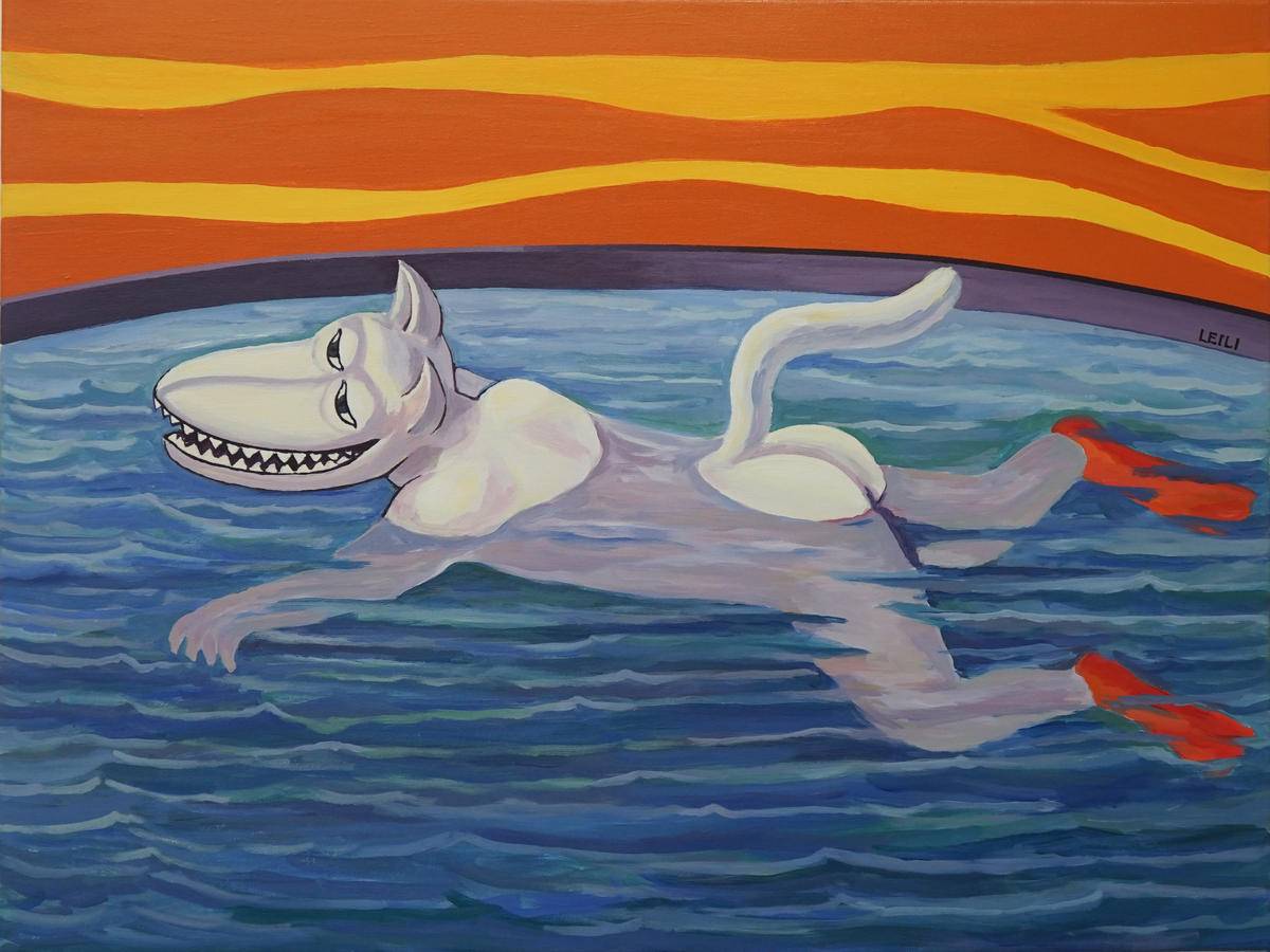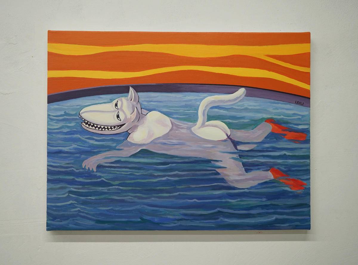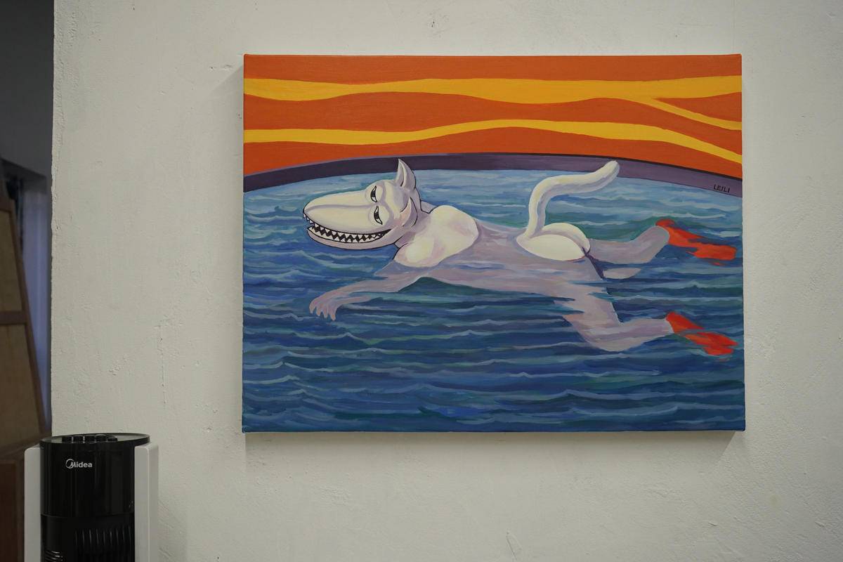 可乐狼系列作品是LEILI&ART的一组原创IP,我们幻想有一片可乐森林,森林里有可乐树,可乐树富含天然的可乐饮品。可乐狼是可乐森林的老大,他喜欢采集可乐、喝可乐泡可乐澡。可乐狼掌管他的可乐森林,在远处,还有一片沙漠,是雪碧沙漠,这幅作品描绘的是雪碧狼在她的沙漠无边泳池游泳的场景。