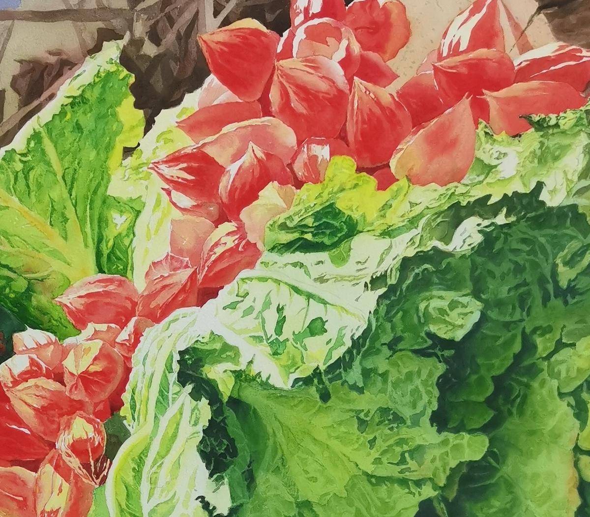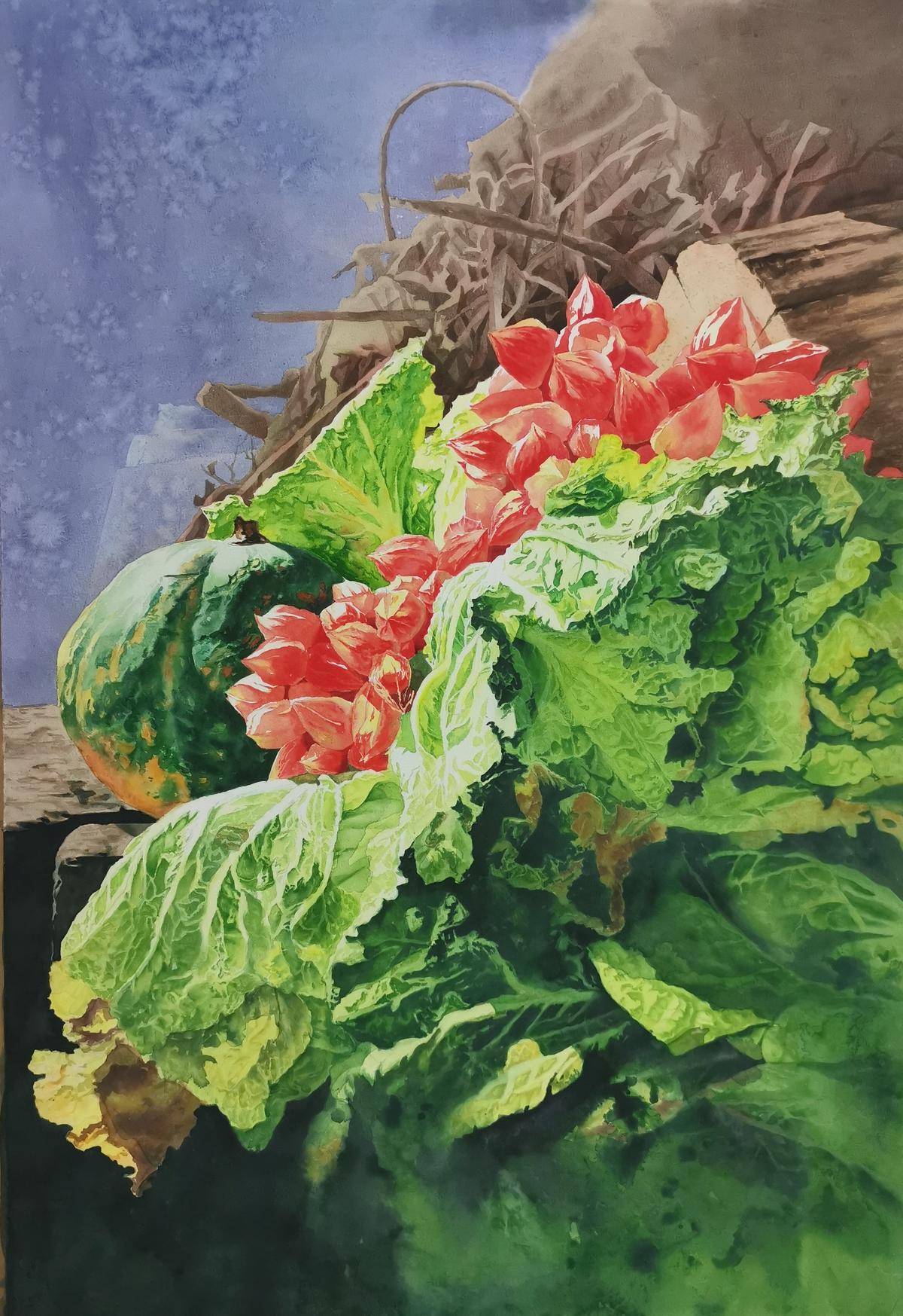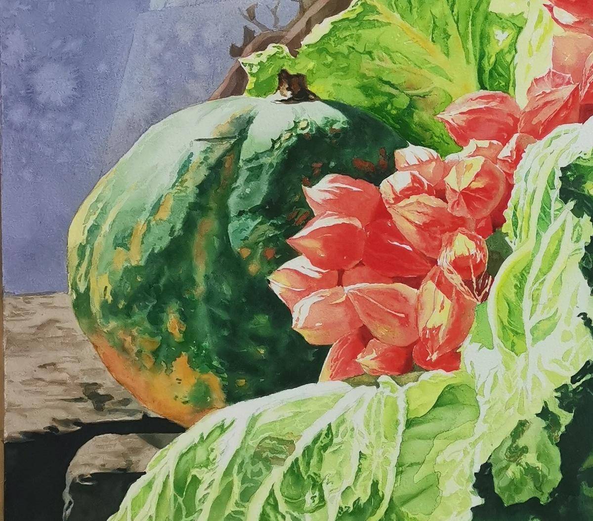 红与绿的经典配色,完美表现了东北的秋天,丰收的喜悦 ,看着心情很好。作品在本市展览获得一等奖,后入选吉林省写生作品展。