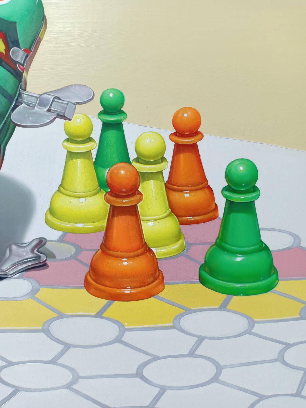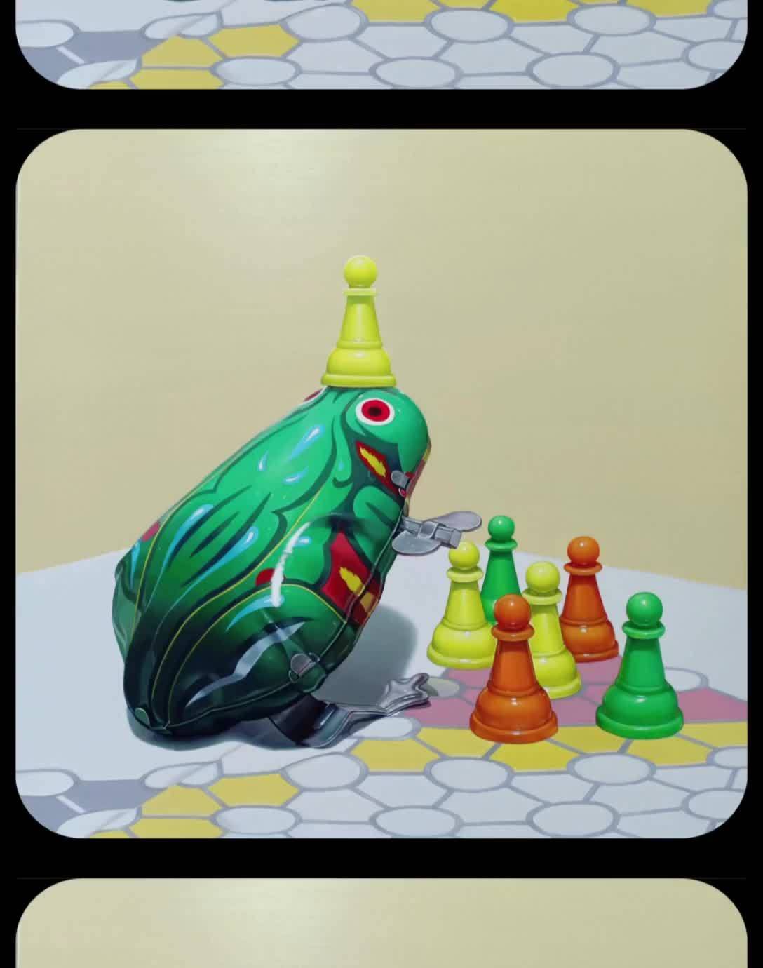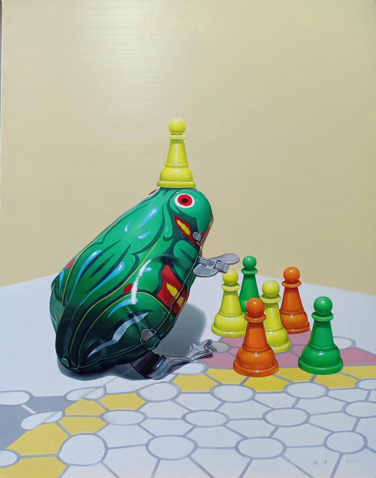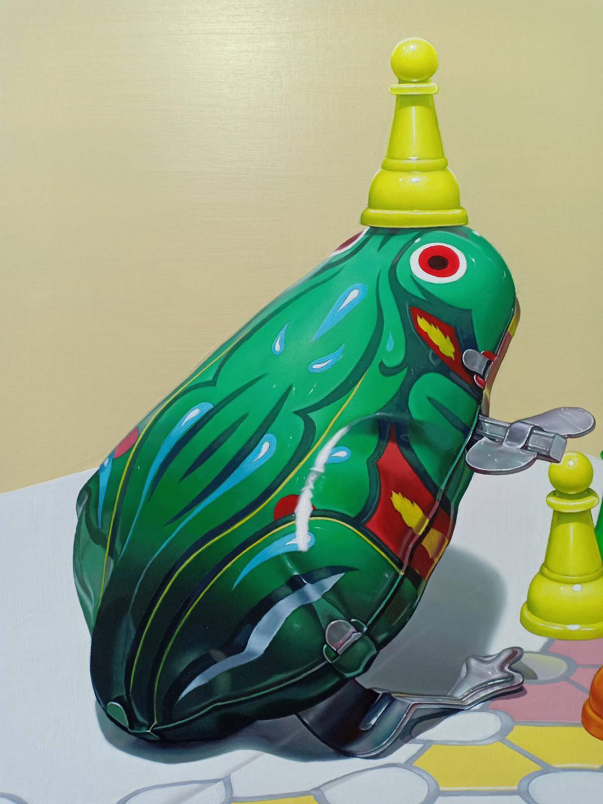 童年系列,铁皮青蛙望着跳棋,青蛙的头上也有一粒跳棋,这样的构思有趣,相互呼应,生动,背景加了跳棋棋盘,主题更加完整明确和谐具有延伸性,也为整个构图增加了当代的趣味。