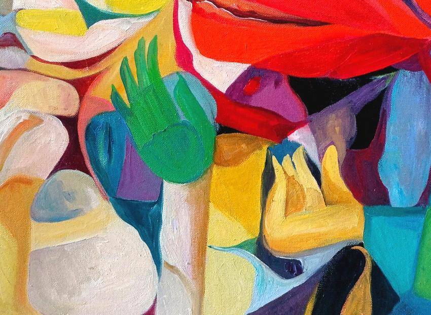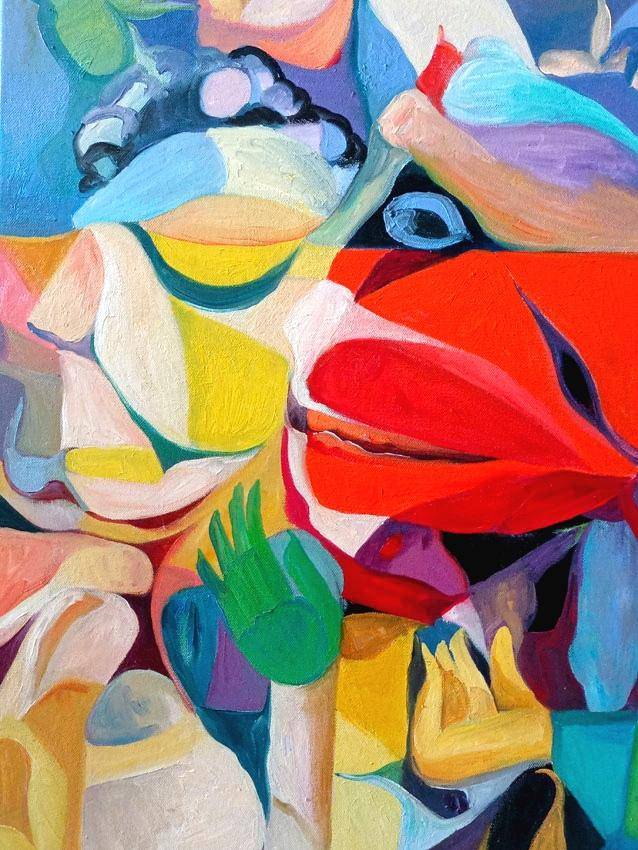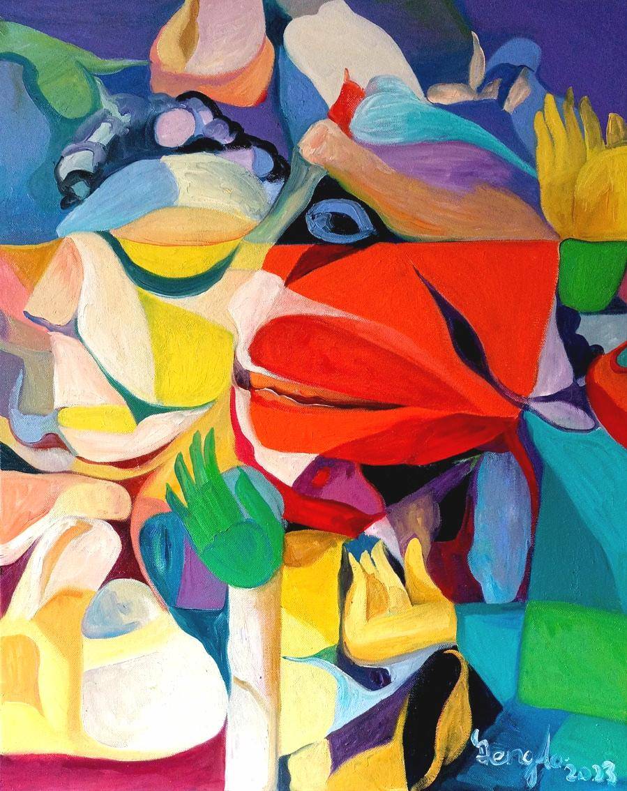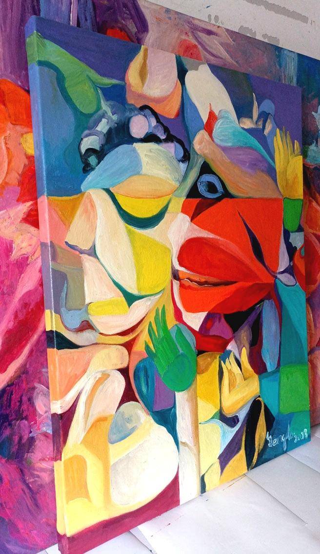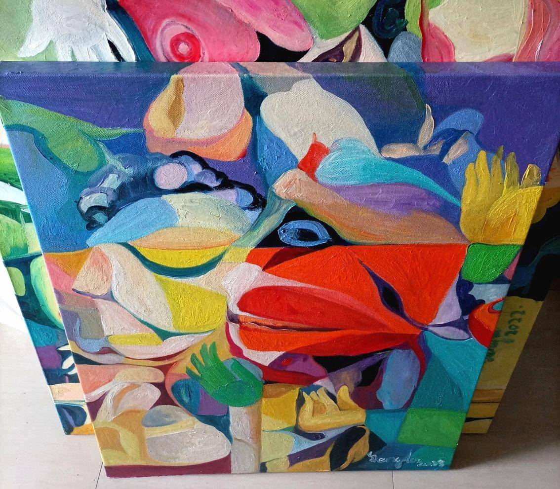 我目前的这个系列油画,都用了原色对比多的色彩,来表达了我理解的情感-生活的原味本色。细腻的情感,抽象的画面表达。