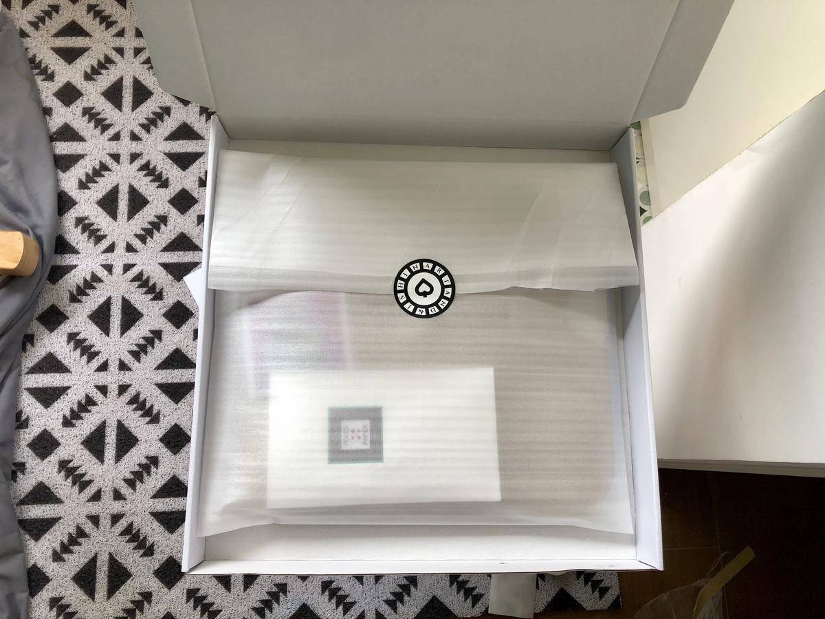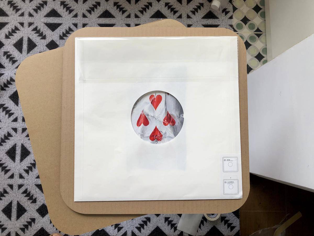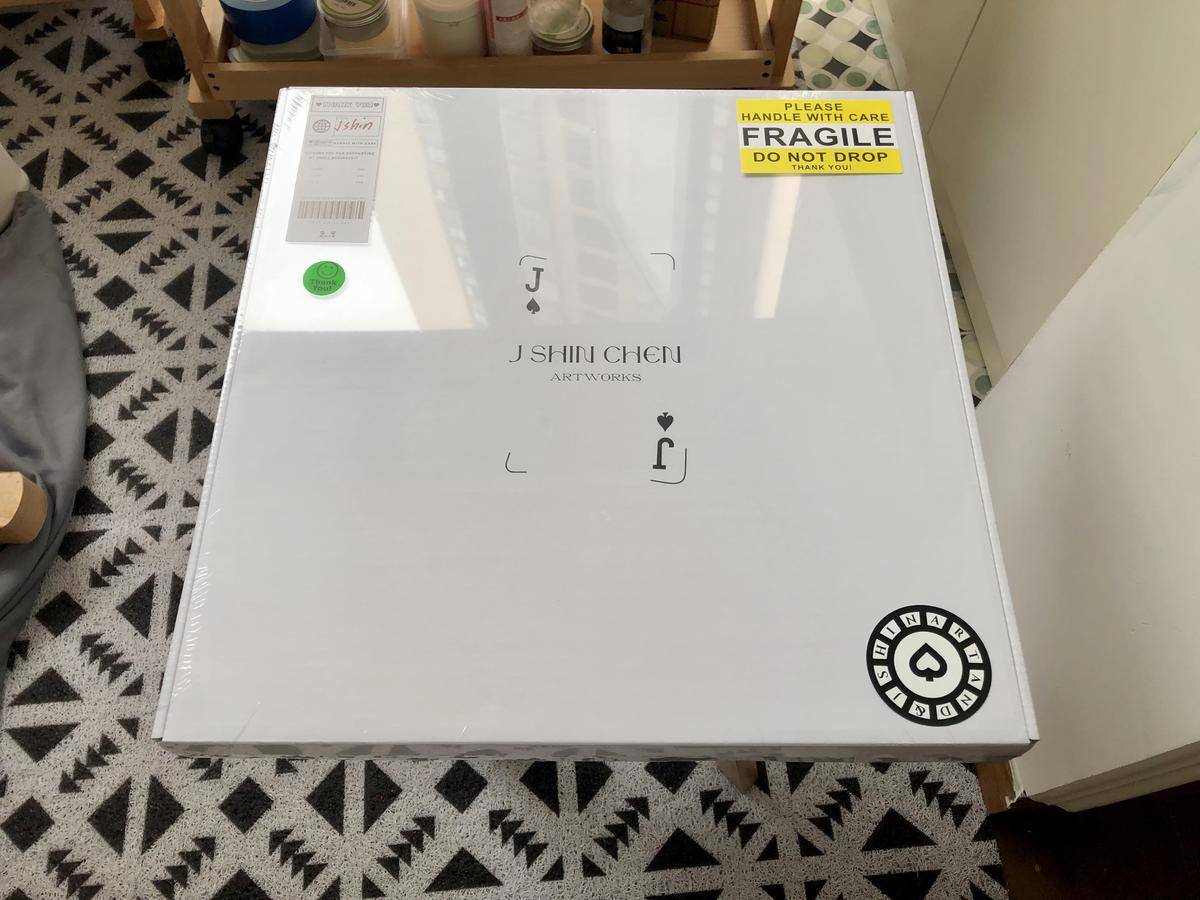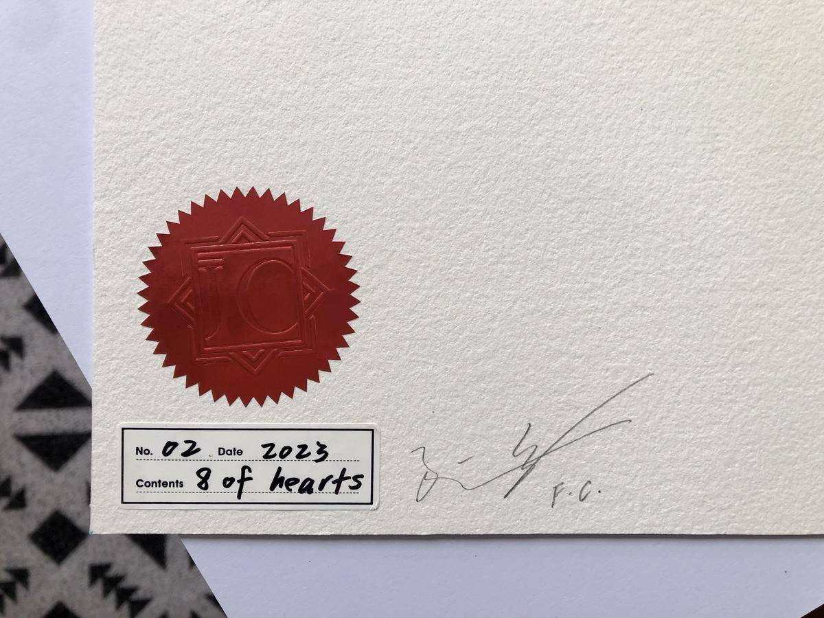 手绘原作艺术品×1(背面签名);塑封×1;镂空收纳薄款纸袋×1;镂空收纳硬质款纸袋×1;固定纸板×2;红色防伪钢印贴×1;艺术家亲签日期及编号贴×1;艺术家亲签身份卡×1;神秘品牌扑克花色标识卡×2;艺术品周边纪念品袜子×1(双);艺术品周边亚克力砝码纪念币×1;珍珠棉保护套×1;外包装纸盒×1