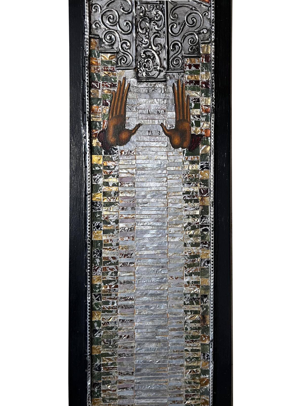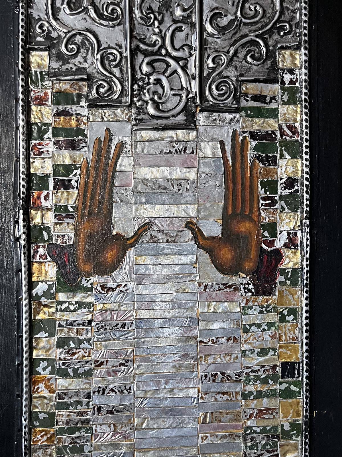 观众可以在作品中看到代表慈爱和博爱摊开的手,并从空洞的铝皮框边缘看出玛利亚和弥赛亚的角色。探究“噪音”及其背后的政治、权力资本,以及圣像在政治权利面前的无效性,它在很多历史悲剧中带来的并不是唤醒人心,而是杀戮的理由。拒绝神圣噪音的操控压迫、摆脱没有生命活力的消极死寂、创造具有无限开放性的积极寂静、将人从技术与噪音的嘈杂喧哗中解放出来。