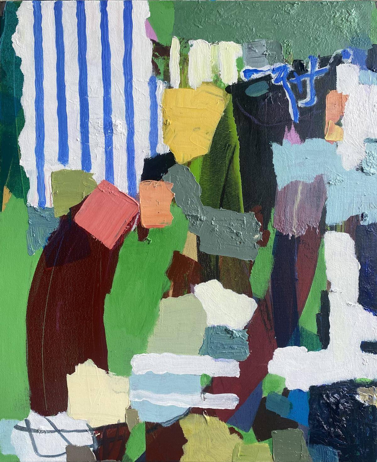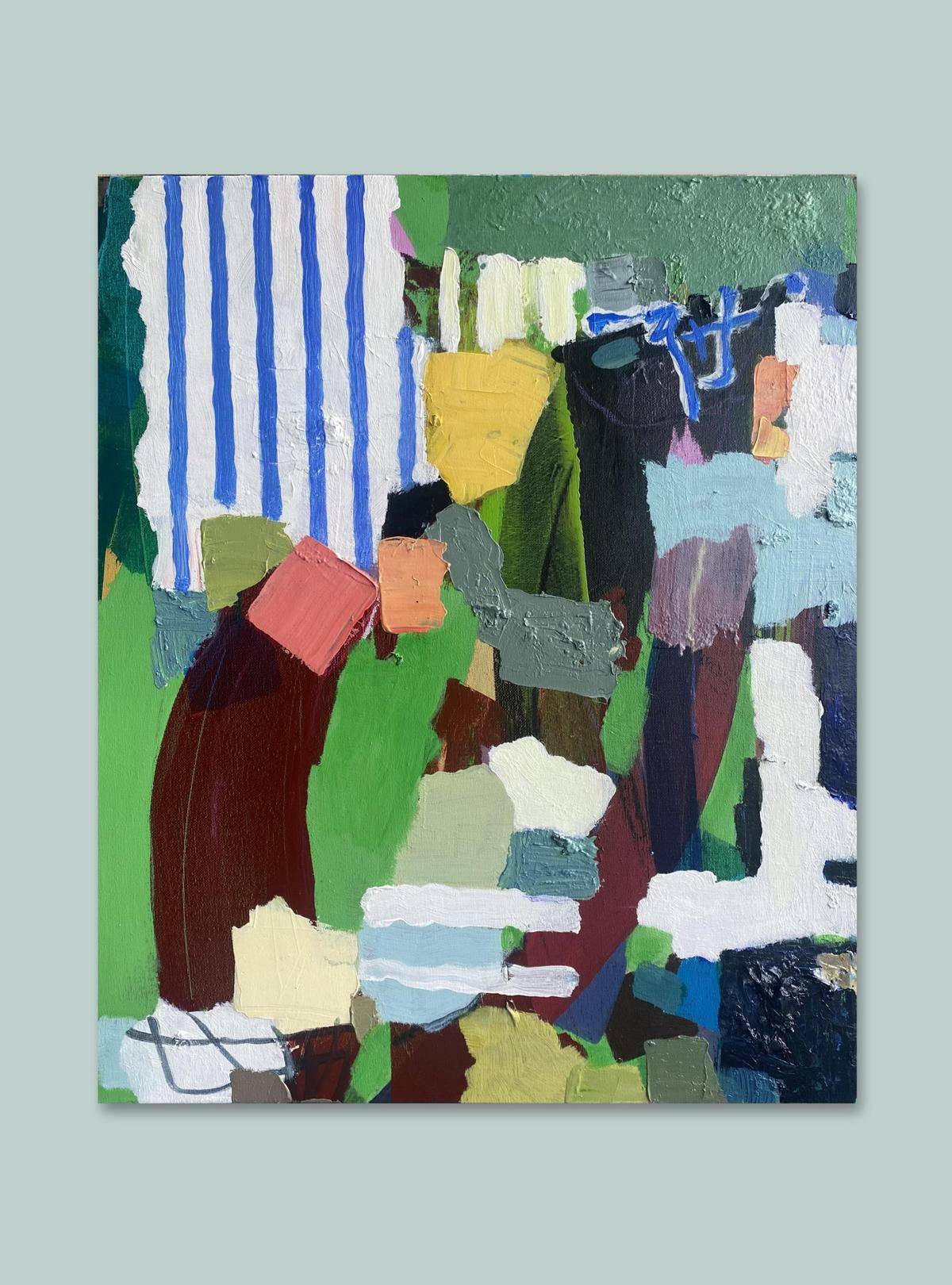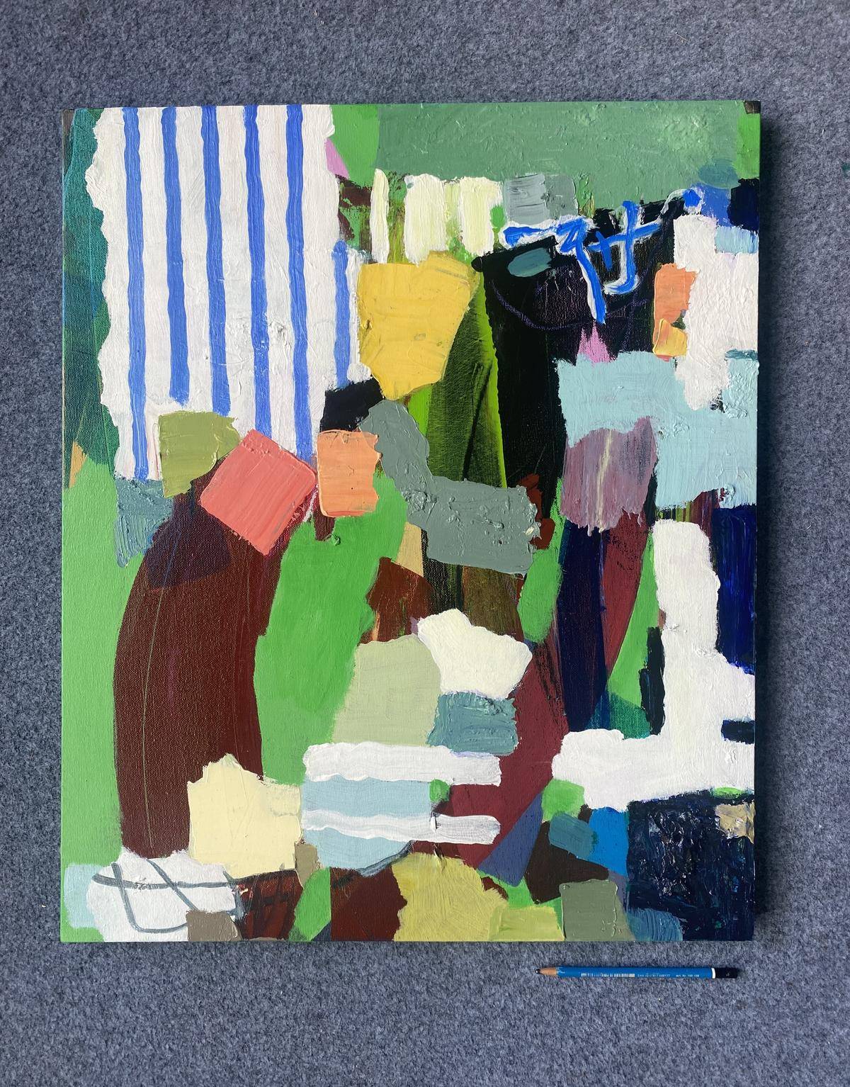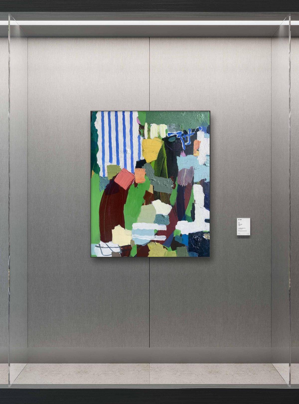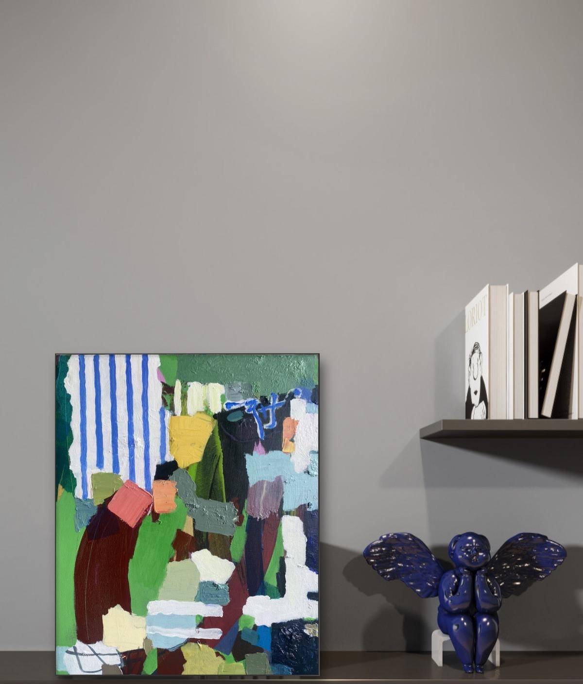 “蓝色条纹”:这个持续的系列是持续的有关于色彩构成、笔触秩序与画面形式的研究,小尺寸,简约无外框无外框无外框可直接悬挂或摆台。抽象表现主义风格画面颜料薄涂与厚涂硬边点线面交错突出材料本身的质感与色彩视觉装饰性之间的平衡更加平面化画面整洁有力,